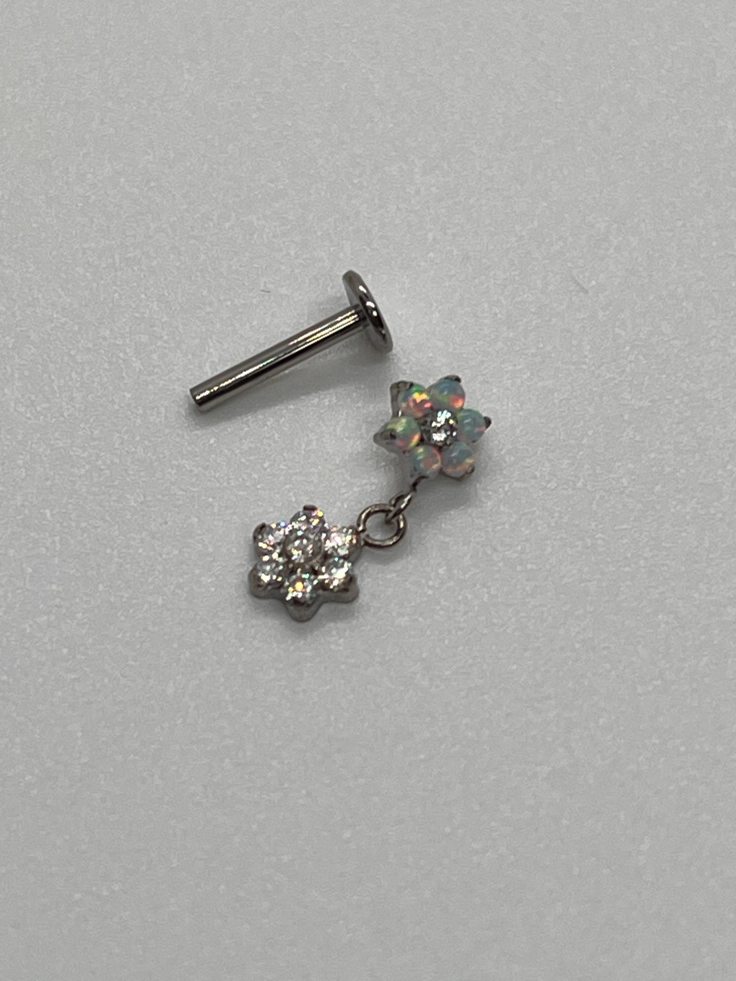 Titánová labreta s dvojitou kvetinkou – jedna opálová hore a pod ňou visiaca “crystal” kvetinka. Strieborné prevedenie, 8 mm, závit 15,00 € 0,00 €
