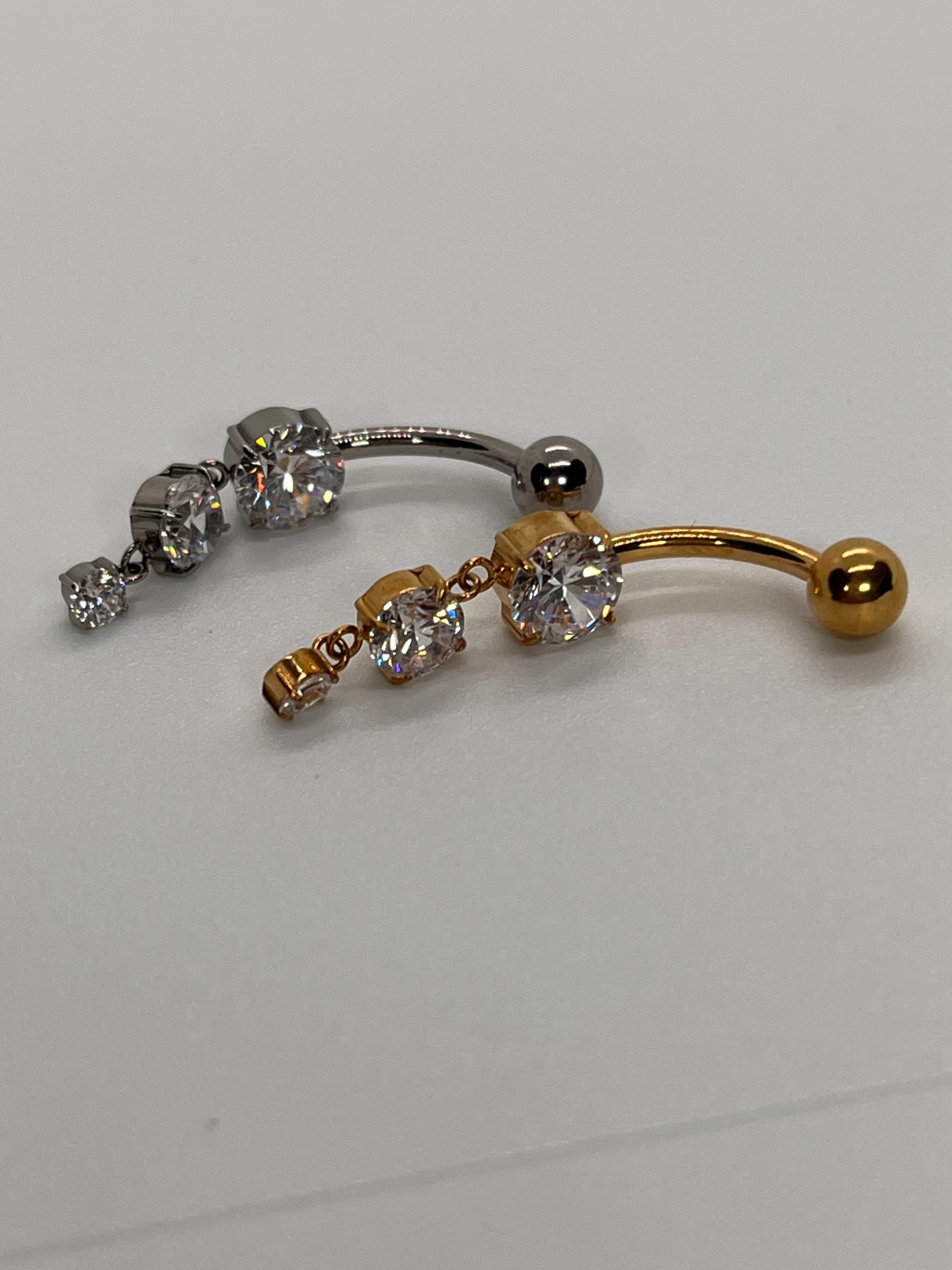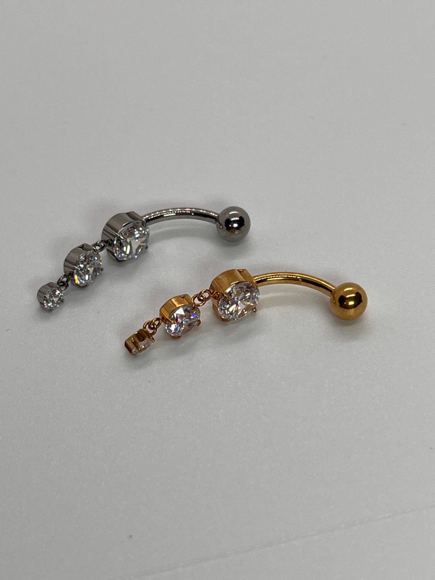 Elegantný titánový piercing do pupka v striebornej alebo zlatej farbe s jemne pohyblivým detailom. Dominantný veľký číry kameň dopĺňa trio trblietavých kamienkov v zavesenom prevedení, ktoré krásne chytá svetlo pri každom pohybe.