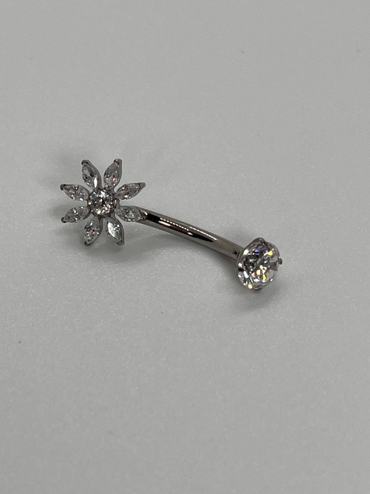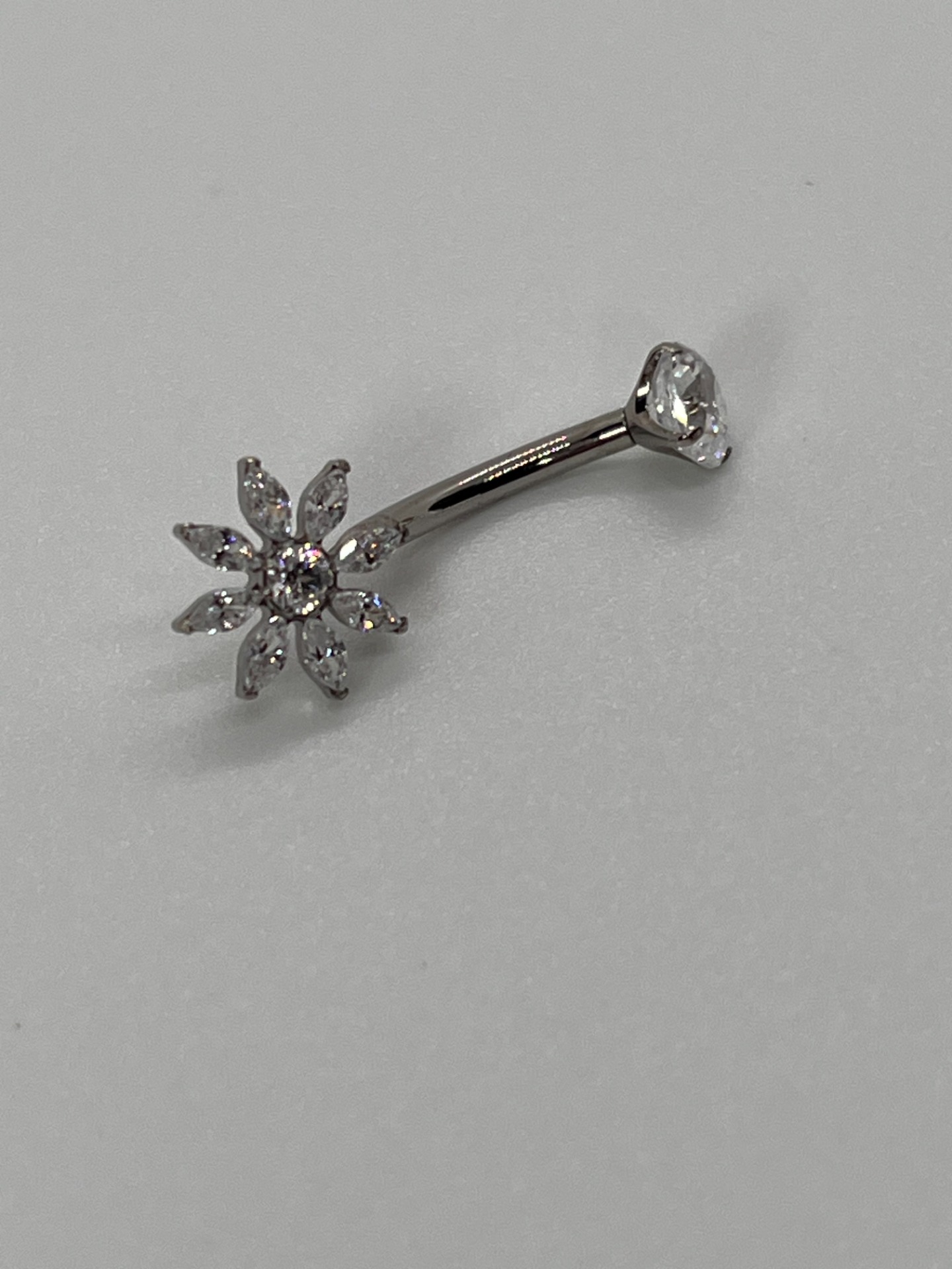 Luxusný titanový piercing do pupka (10 mm) v striebornej alebo zlatej farbe. Vrchný číry kameň dopĺňa spodná ozdoba v tvare trblietavej kvetinky z brúsených kamienkov, ktoré krásne odrážajú svetlo. Elegantný a výrazný šperk, ktorý vynikne v plavkách aj v crop topoch.
