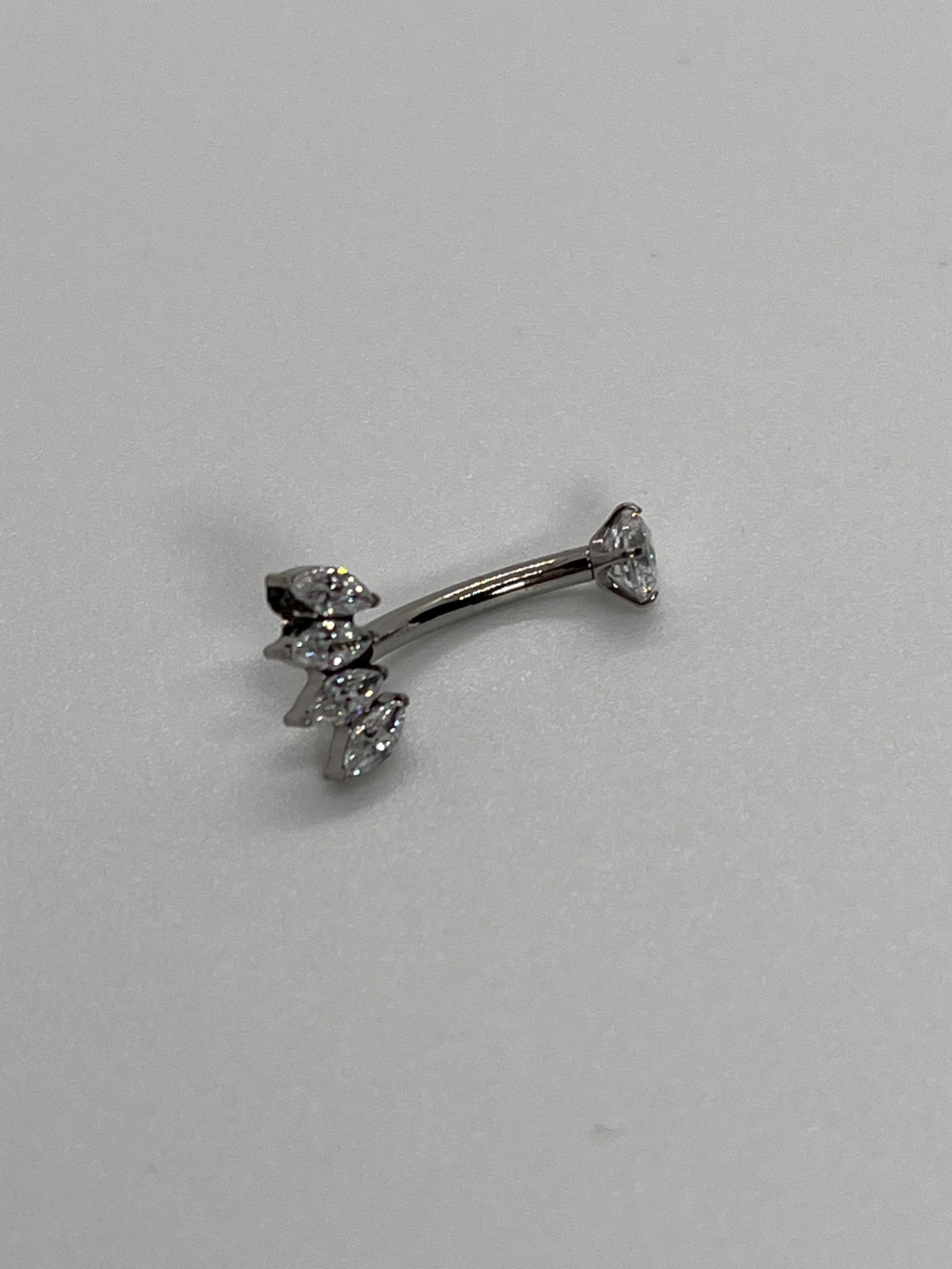 Elegantný titánový šperk do pupka v striebornej farbe s čírymi kamienkami. Spodnú časť zdobí "lístkový" dizajn z marquise kamienkov, ktorý krásne chytá svetlo a pôsobí jemne, no zároveň luxusne.