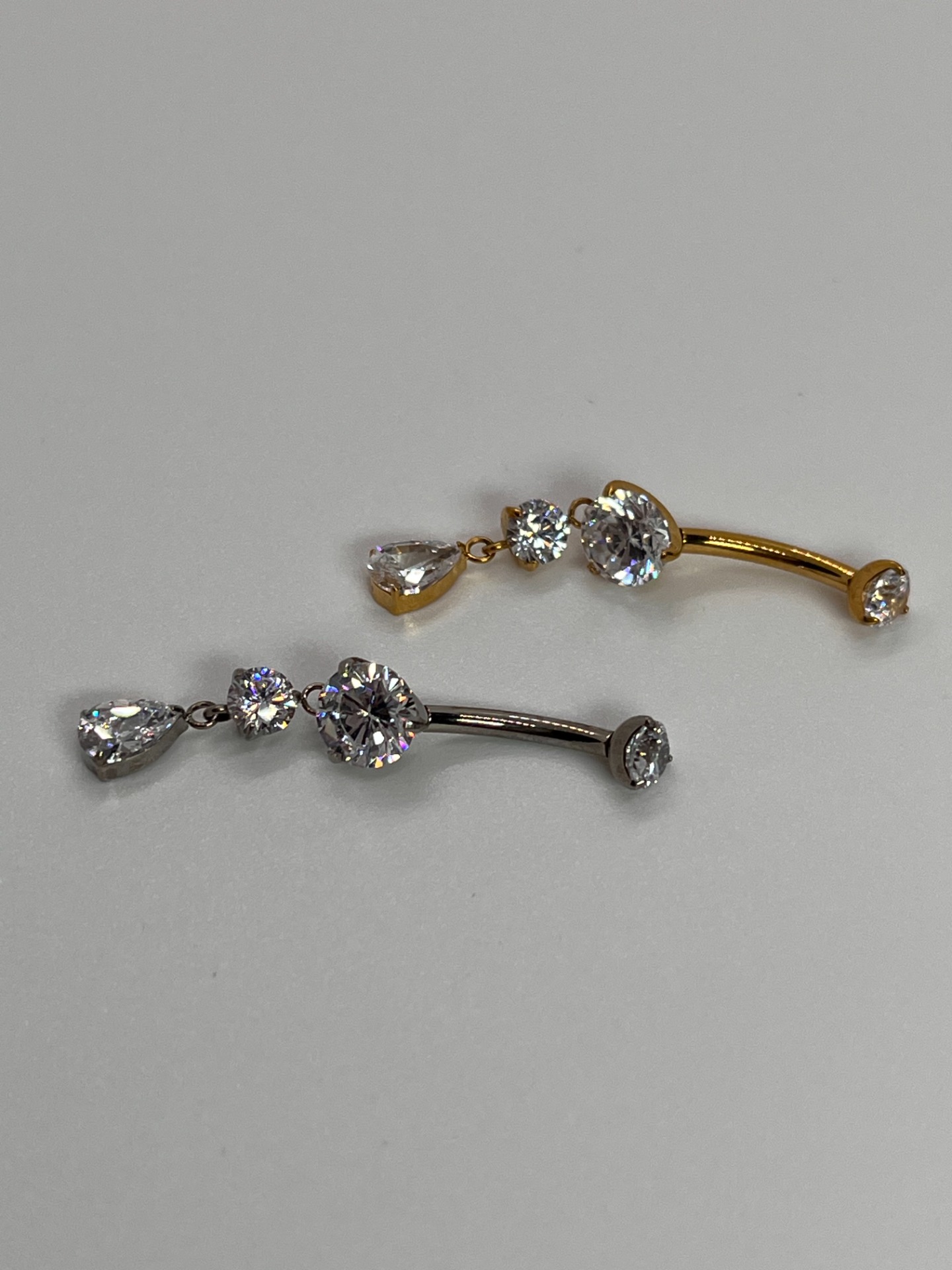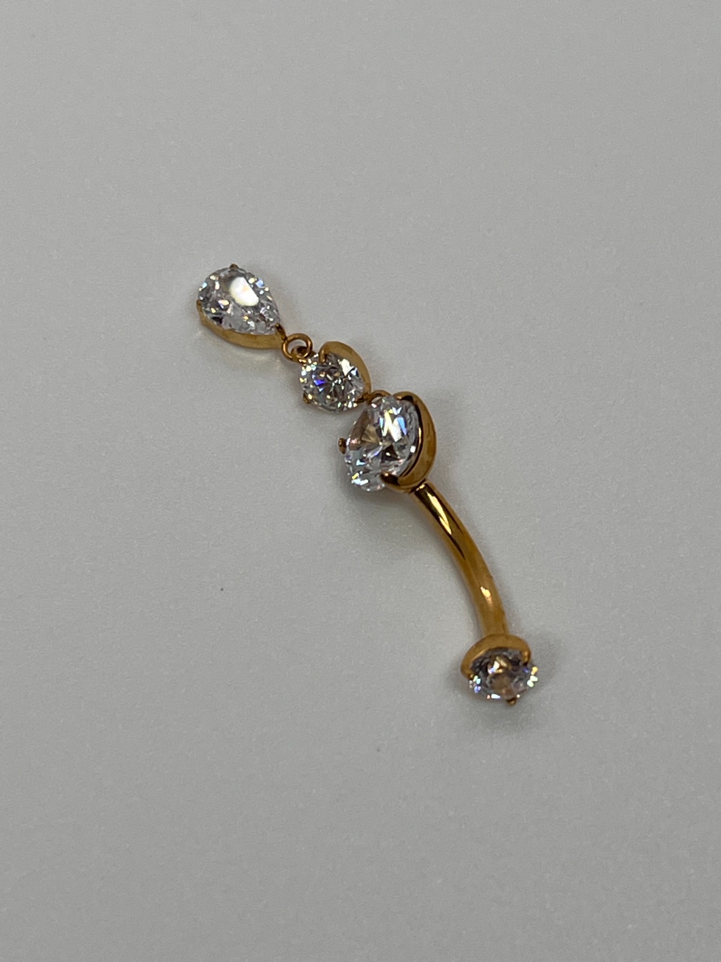 Elegantný titánový šperk do pupka s trojicou čírych zirkónov a jemnou visiacu slzičkou. Luxusný "sparkle" efekt, ktorý krásne vynikne na brušku – ideálny na výraznejší, no stále čistý a elegantný look.