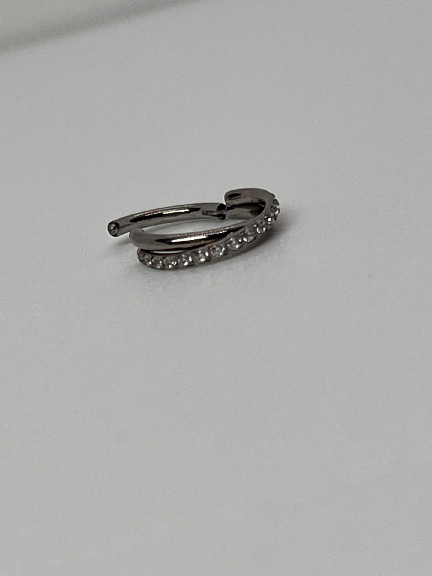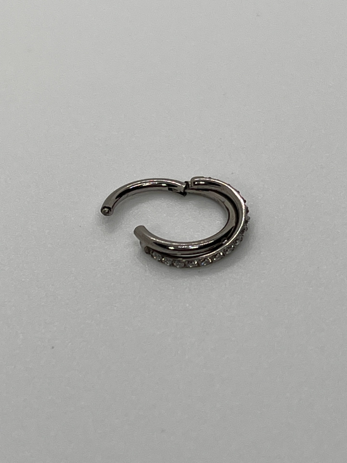 Titanový clicker krúžok v striebornej farbe s jemným pásikom trblietavých kamienkov. Minimalistický, ale efektný – ideálny na každodenné nosenie aj na vrstvenie s ďalšími šperkami.