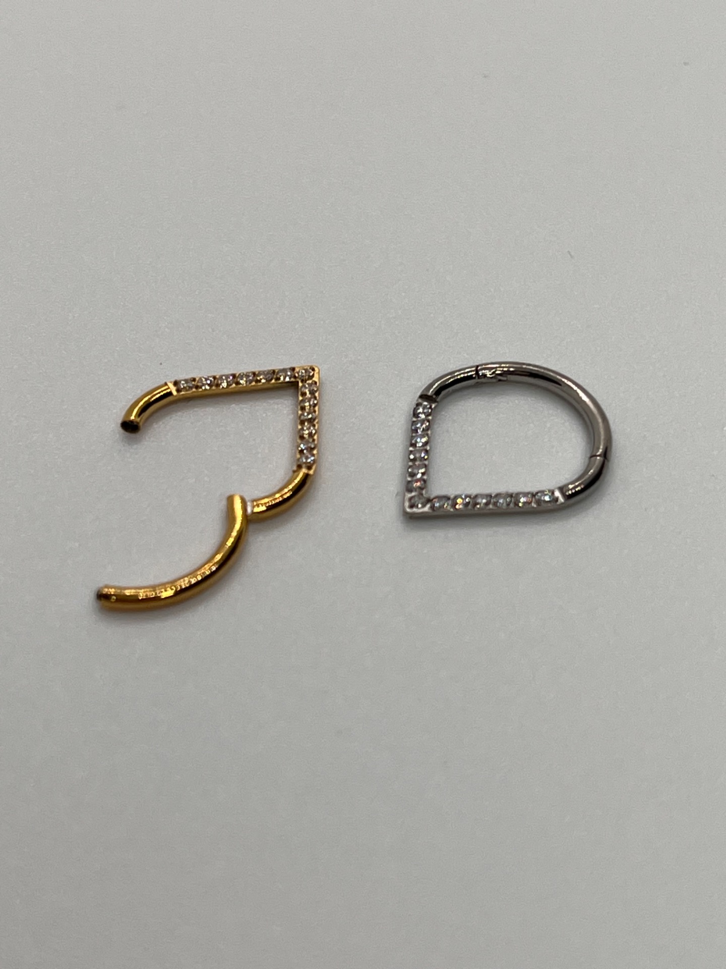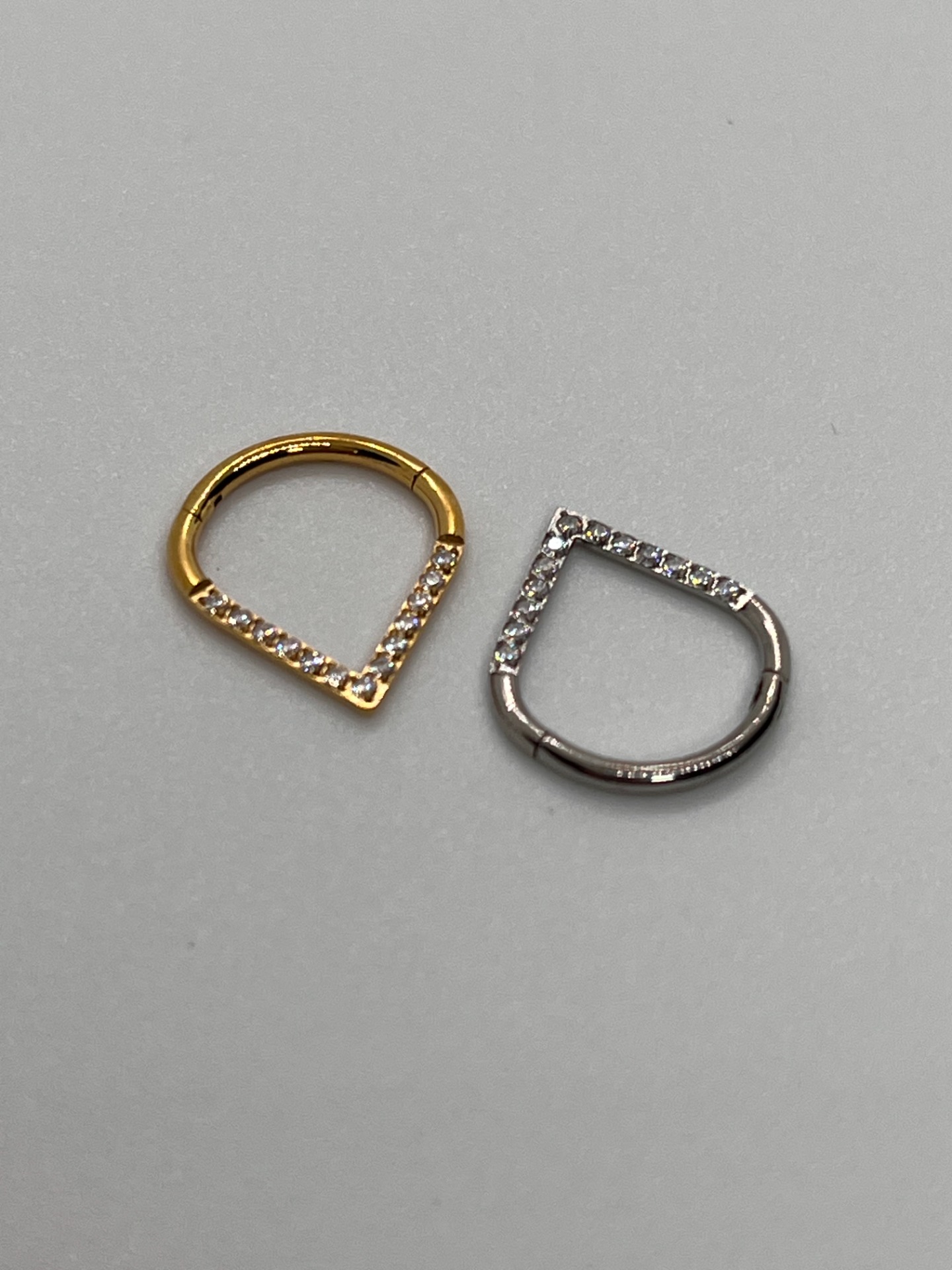 Elegantný tvarovaný clicker z titánu, ktorý sa pohodlne zapína "zacvaknutím". Predná časť je zdobená jemnými žiarivými kamienkami, vďaka čomu šperk pôsobí luxusne, no stále čisto a minimalisticky. Skvelý na každodenné nosenie aj ako výraznejší detail do ucha alebo septa.