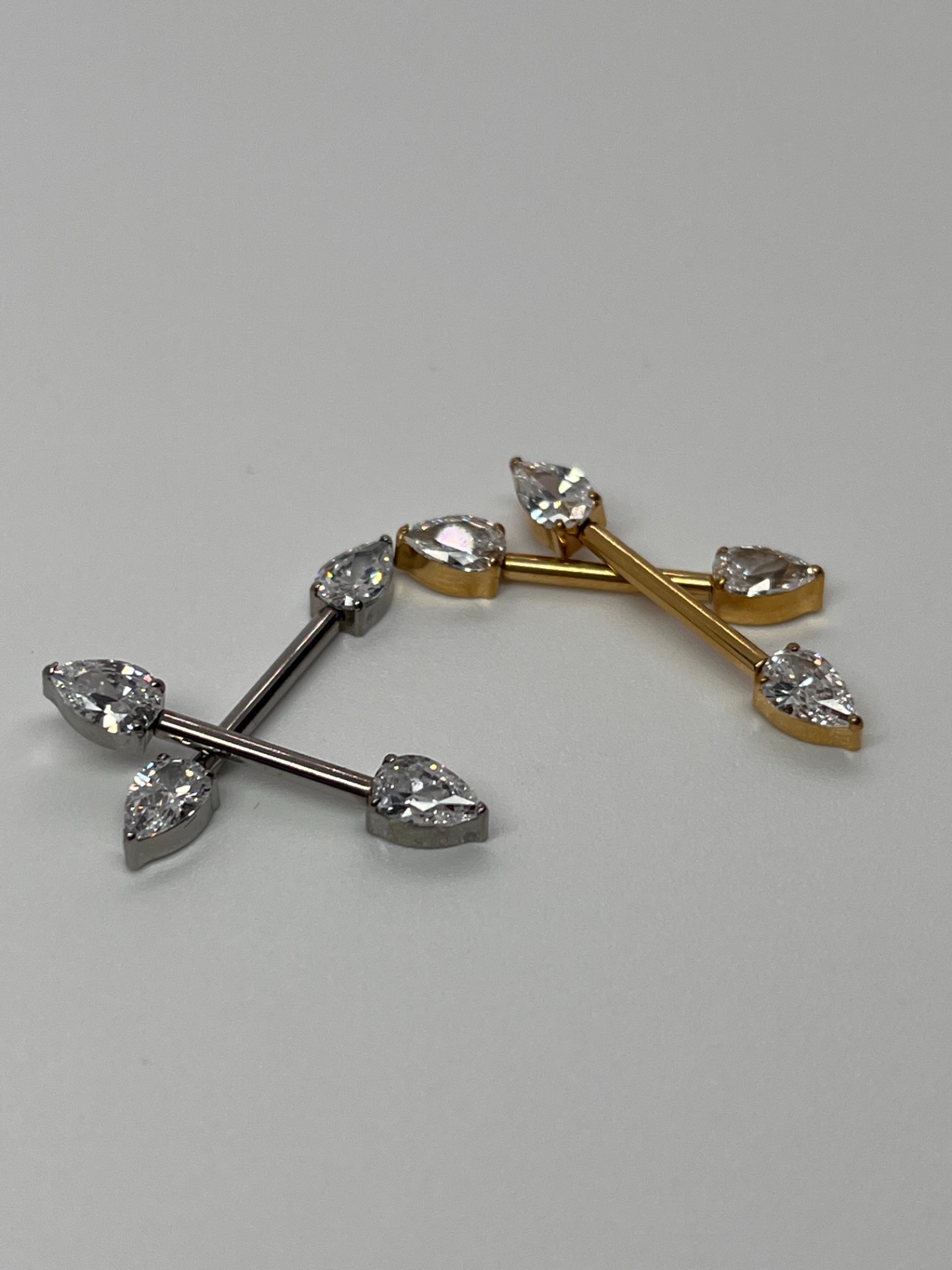 Elegantný nipple šperk z titánu s dvomi kvapkovými kamienkami, ktoré krásne chytajú svetlo a pôsobia jemne, ale luxusne.