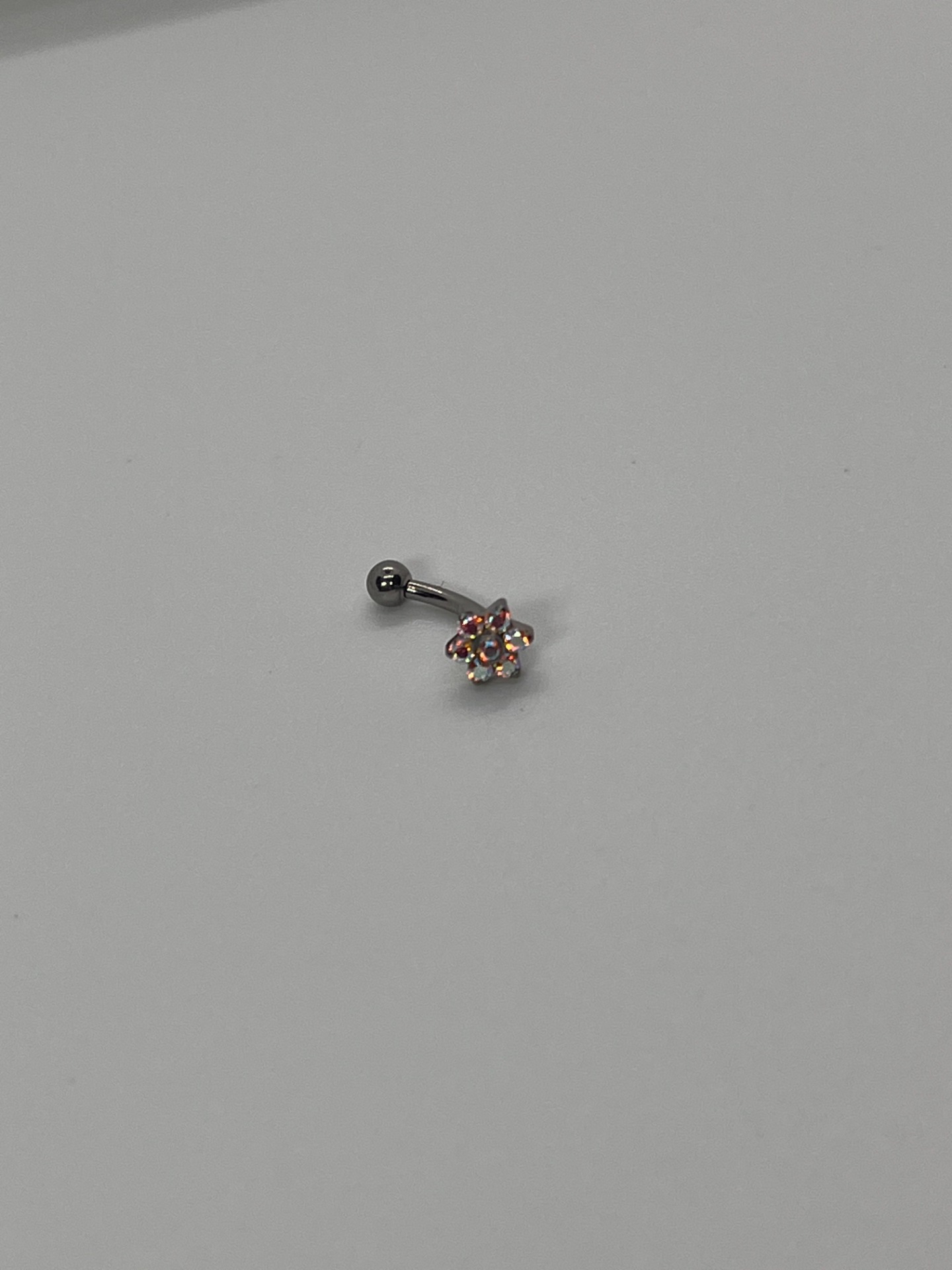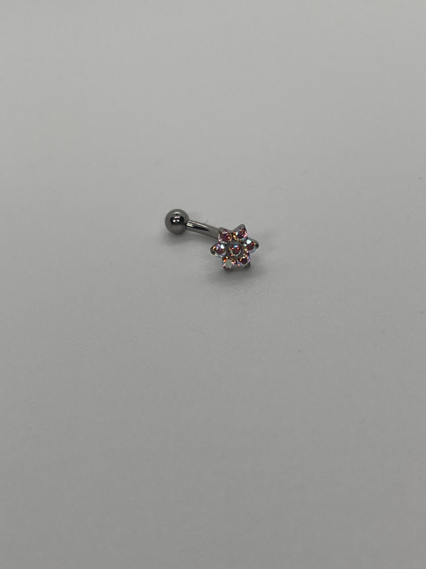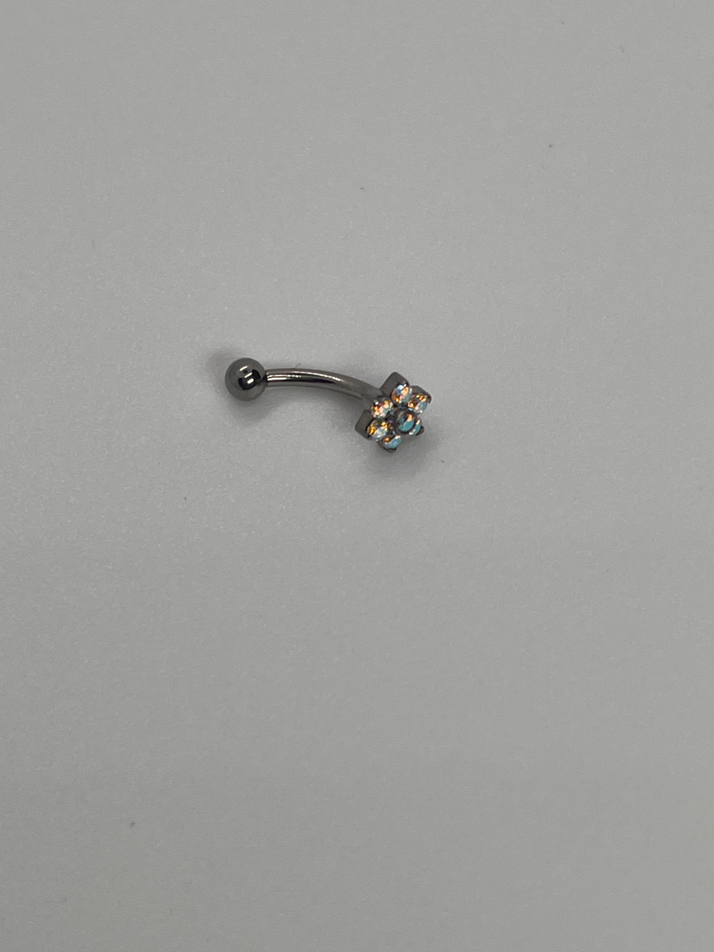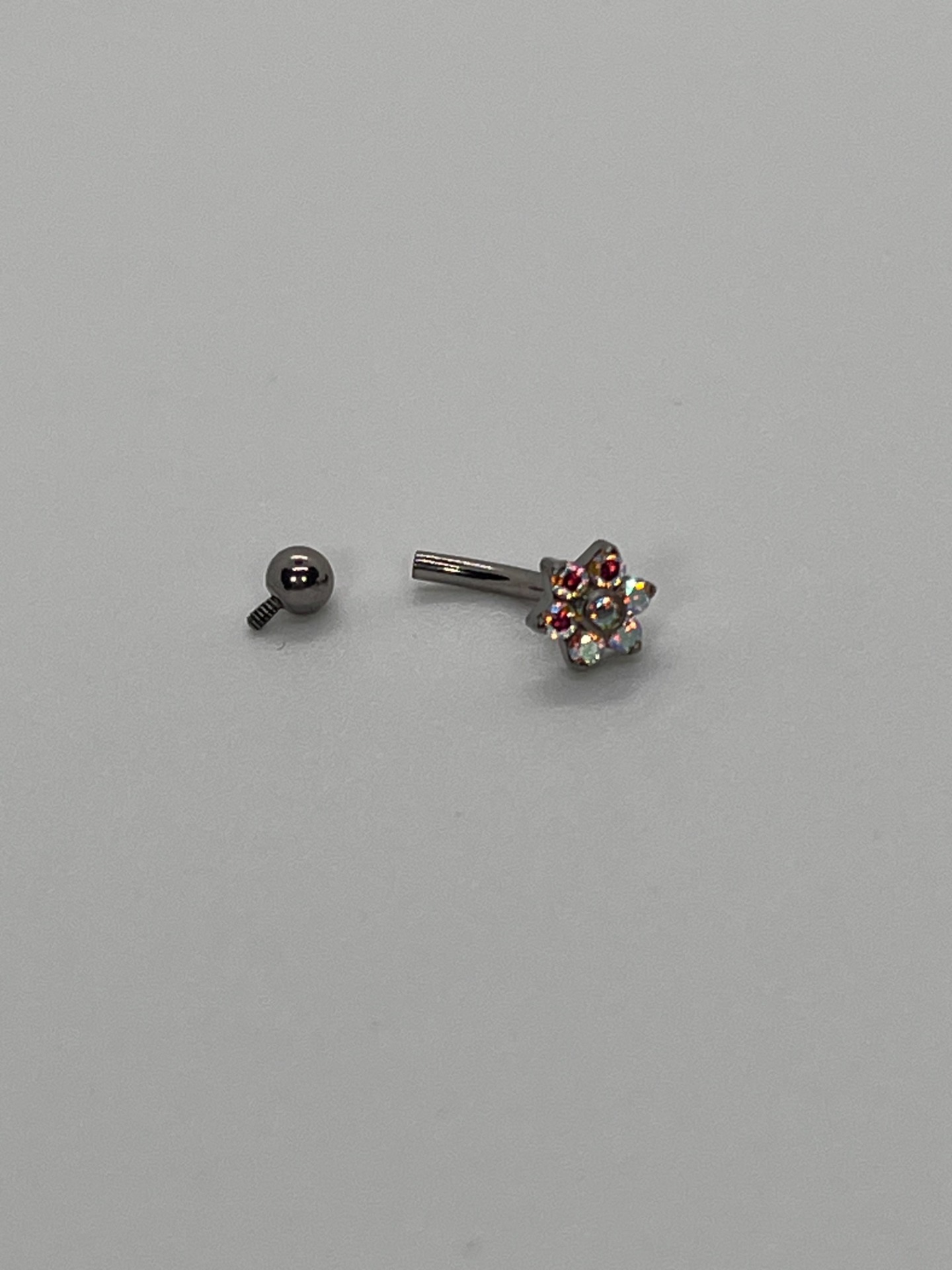 Elegantná rook náušnica z titánu so žiarivým kvetom z kamienkov (aurora efekt). Závitové zapínanie, strieborné prevedenie, dostupná v dĺžkach 6 mm alebo 8 mm.