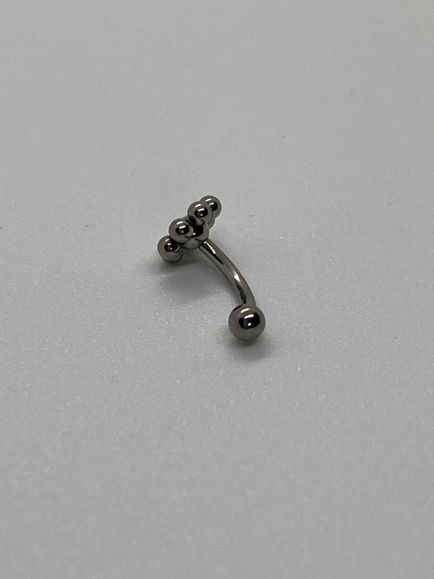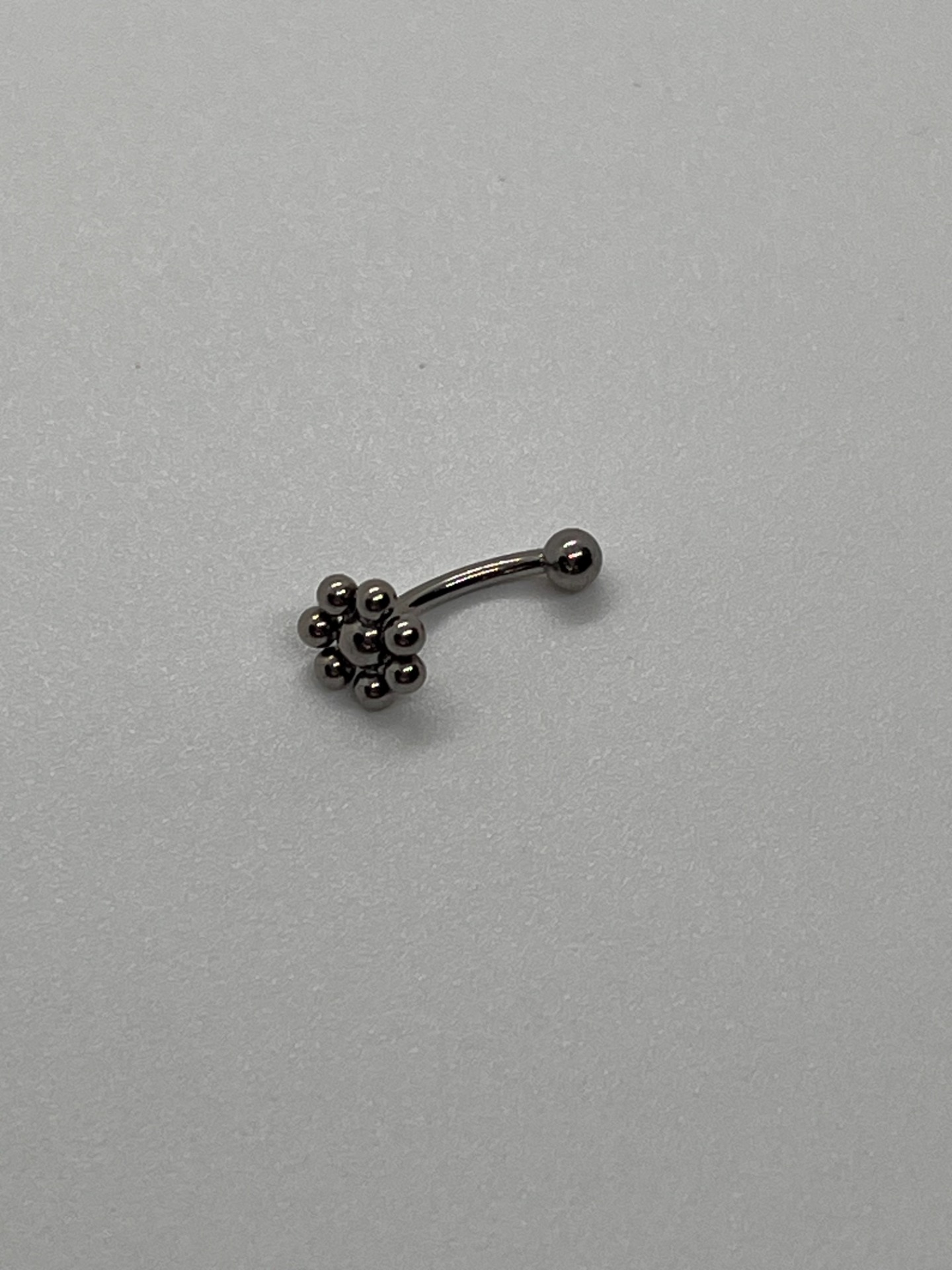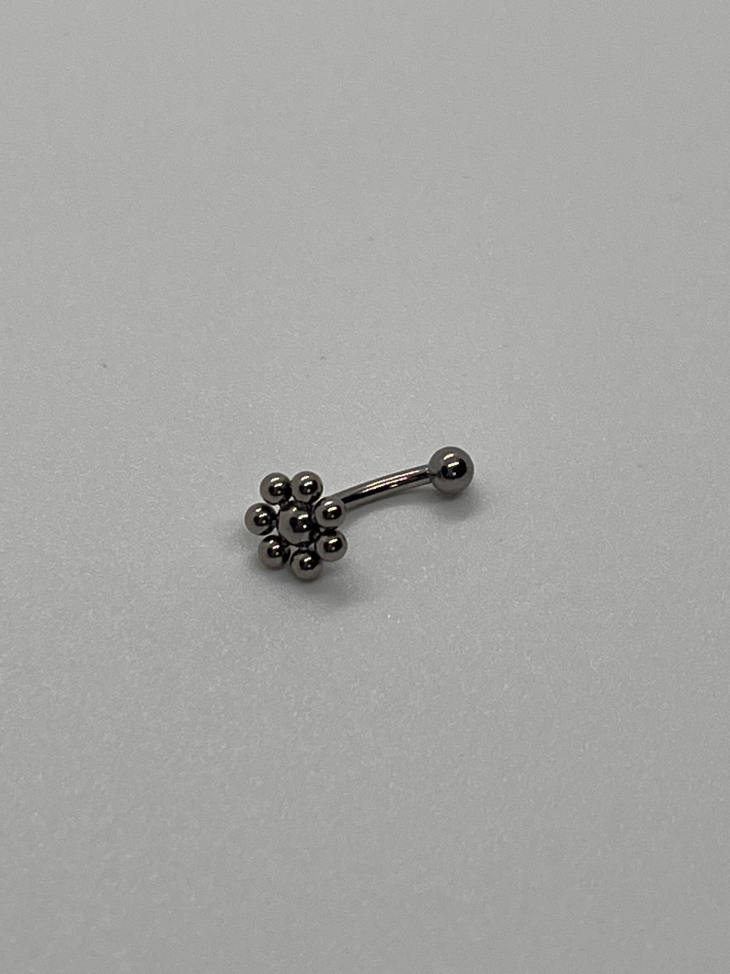 Minimalistická rook náušnica z titánu s dizajnom guľôčkového kvietku (bubble flower). Závitové zapínanie, dĺžka 8 mm, strieborné prevedenie – ideálna na každodenné nosenie.