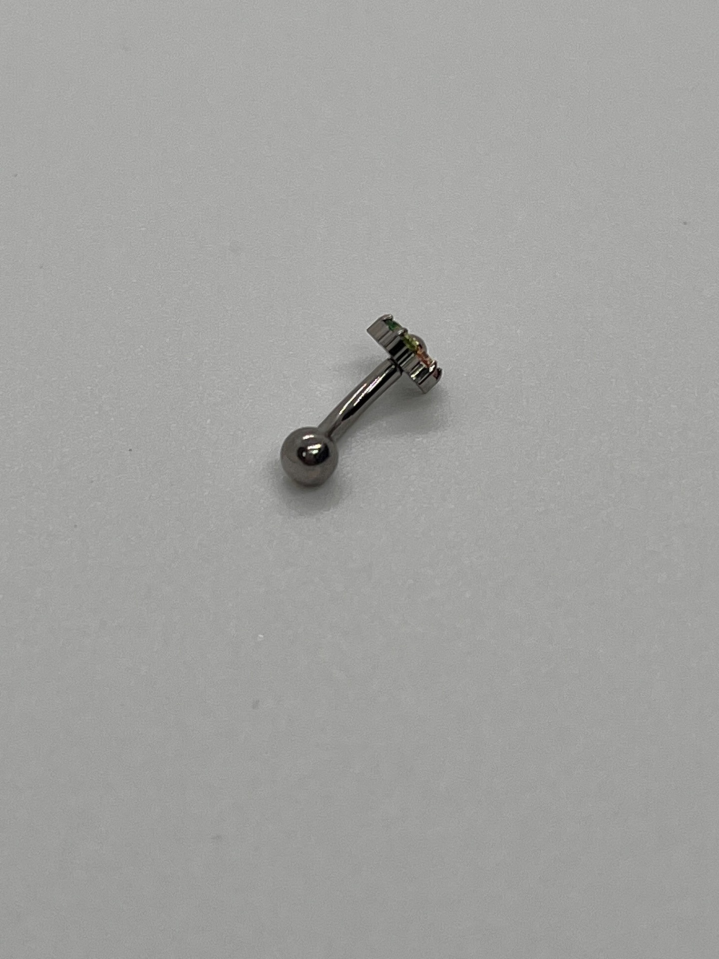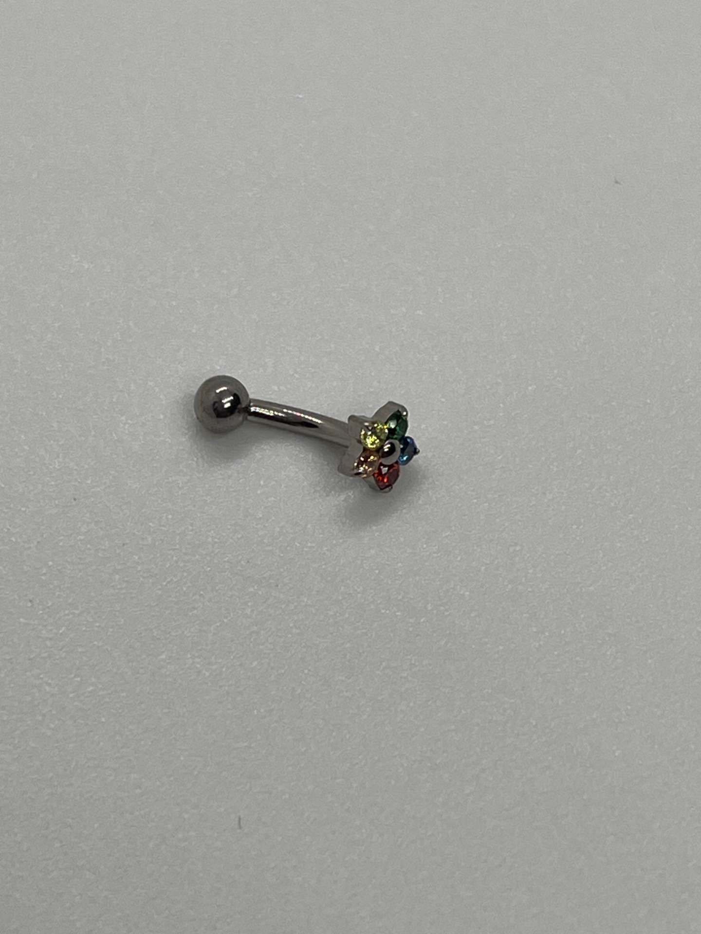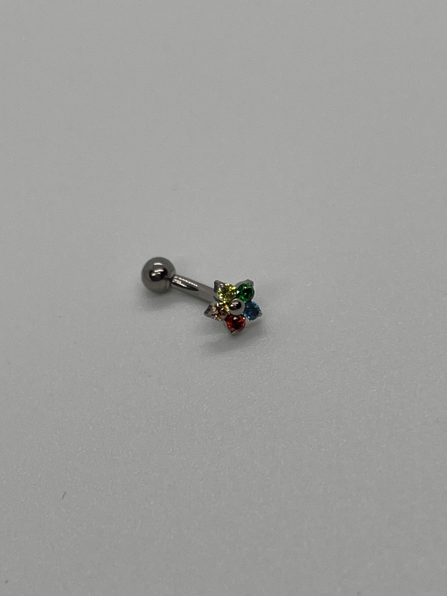 Jemná rook náušnica z titánu s mini kvietkom z farebných kamienkov pre decentný "rainbow" efekt. Závitové zapínanie, dĺžka 6 mm a 8mm, strieborné prevedenie.
