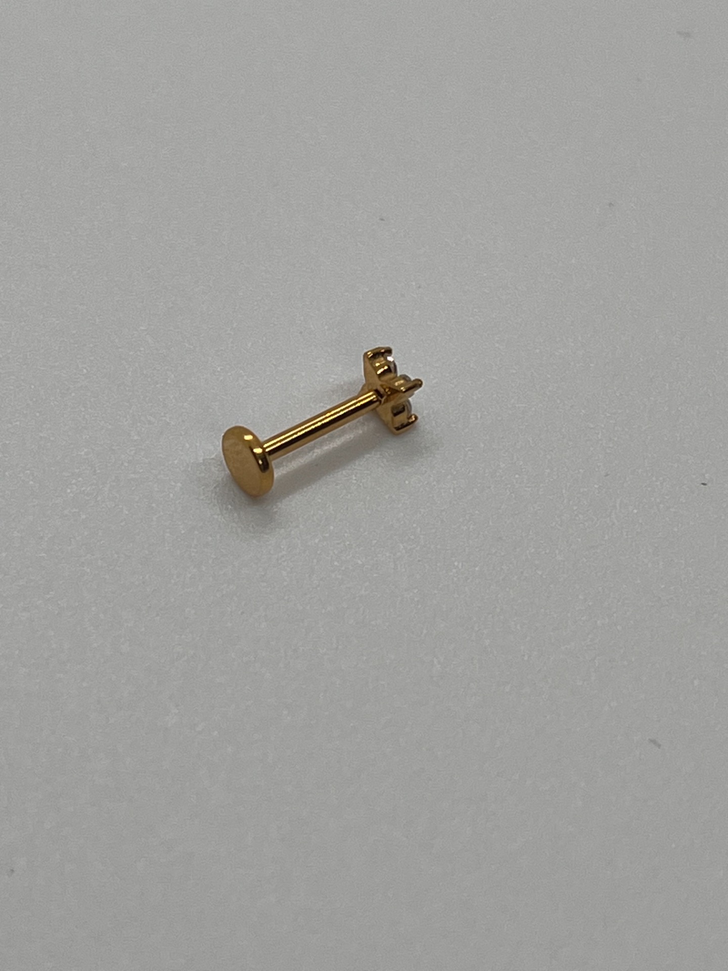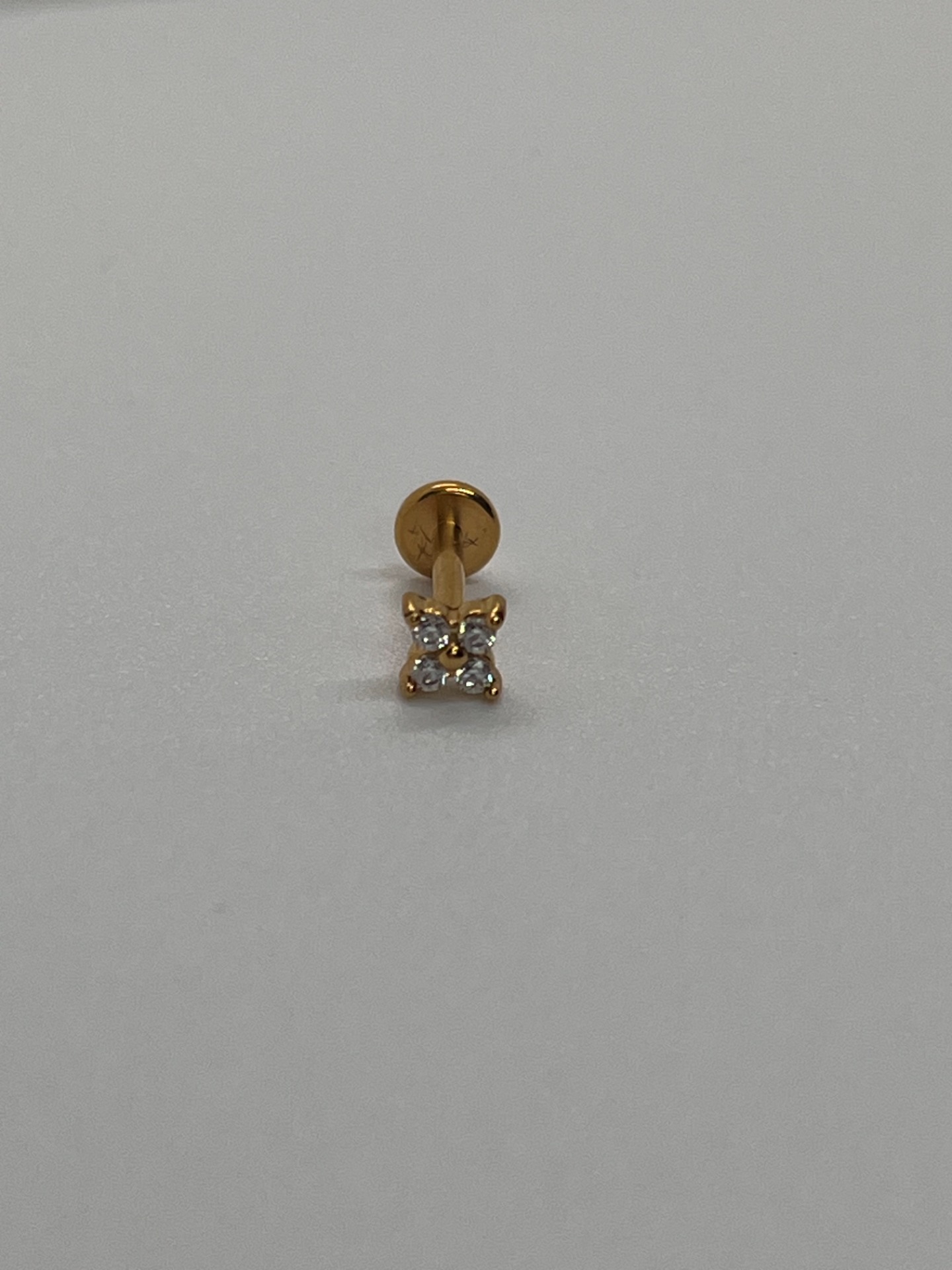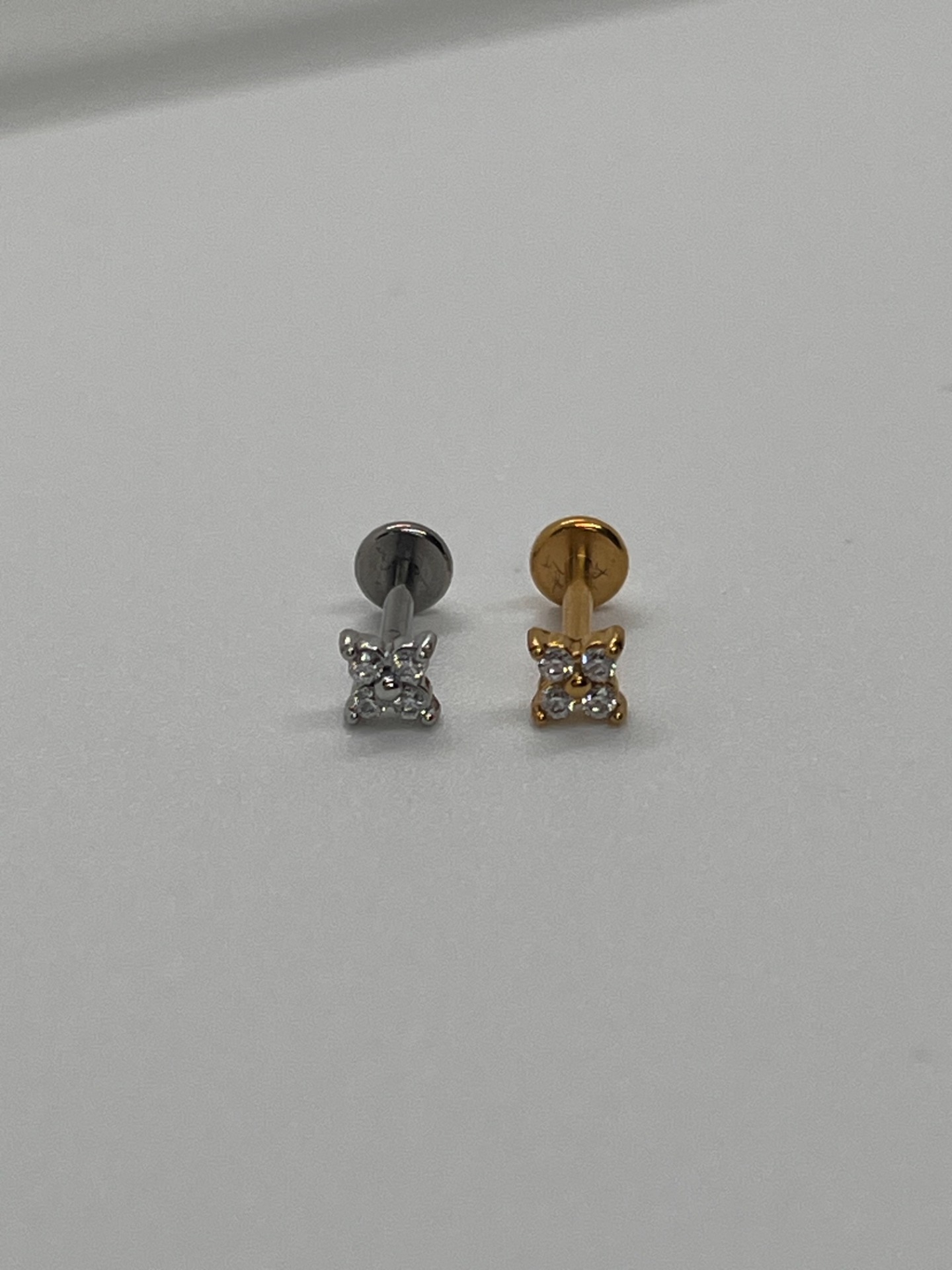 Trblietavý štvorlístok (clover) z kamienkov pre jemný "sparkle" efekt a nádych šťastia. Titánový push-in (threadless) piercing v dĺžke 6 mm alebo 8 mm, dostupný v striebornom aj zlatom prevedení.