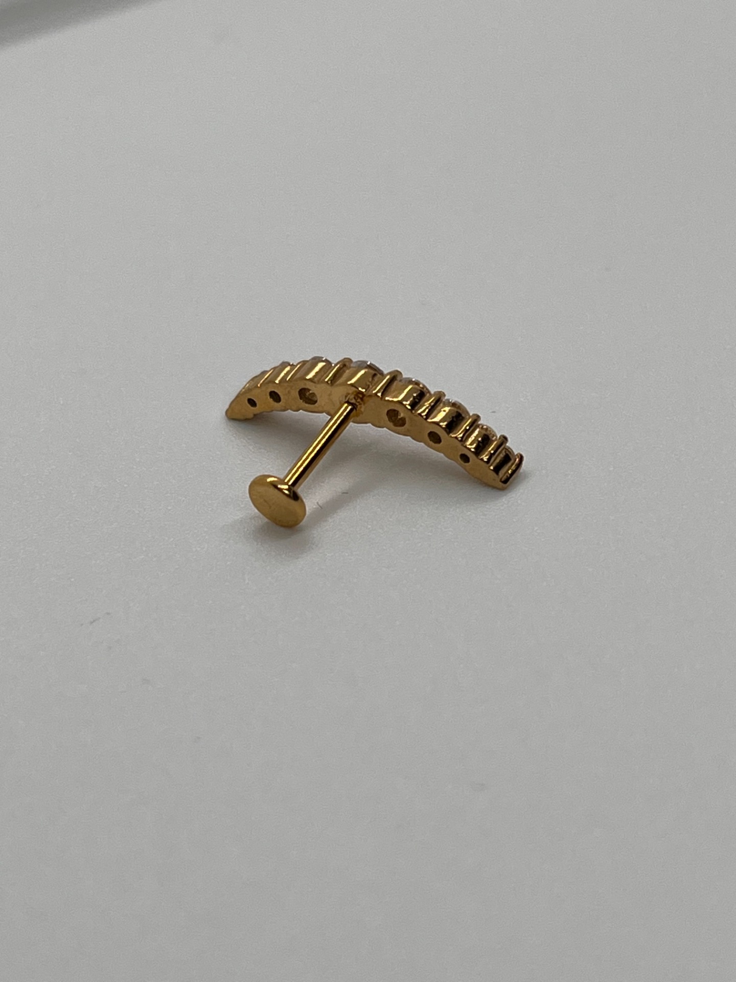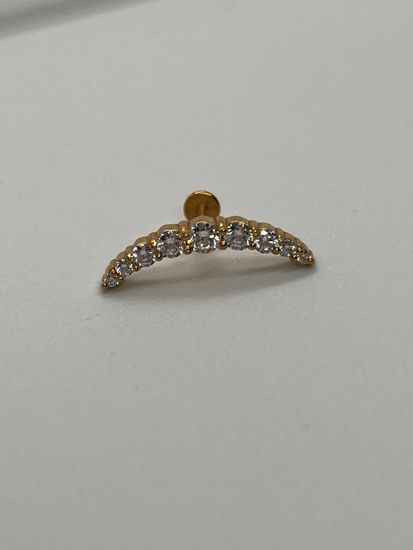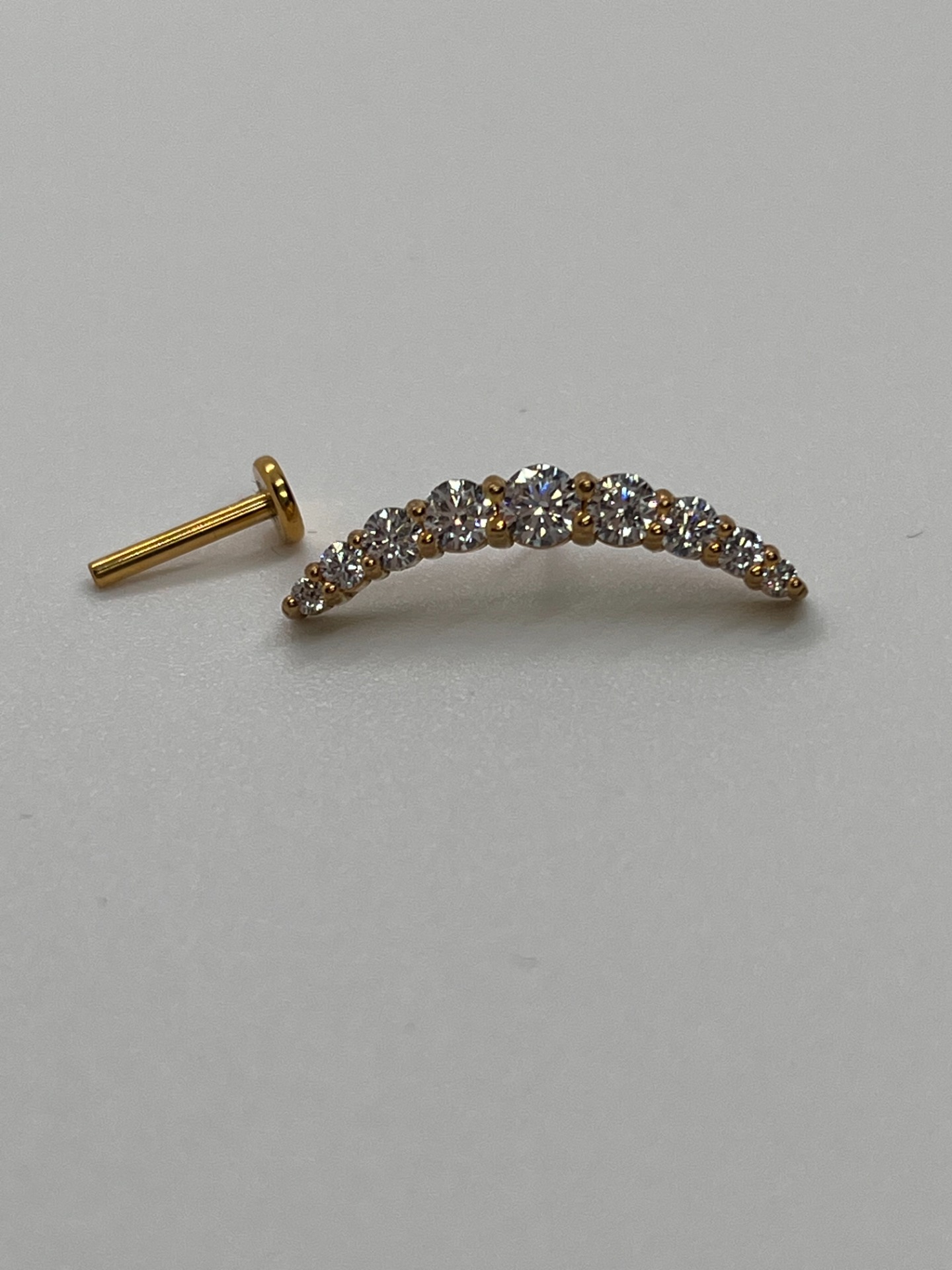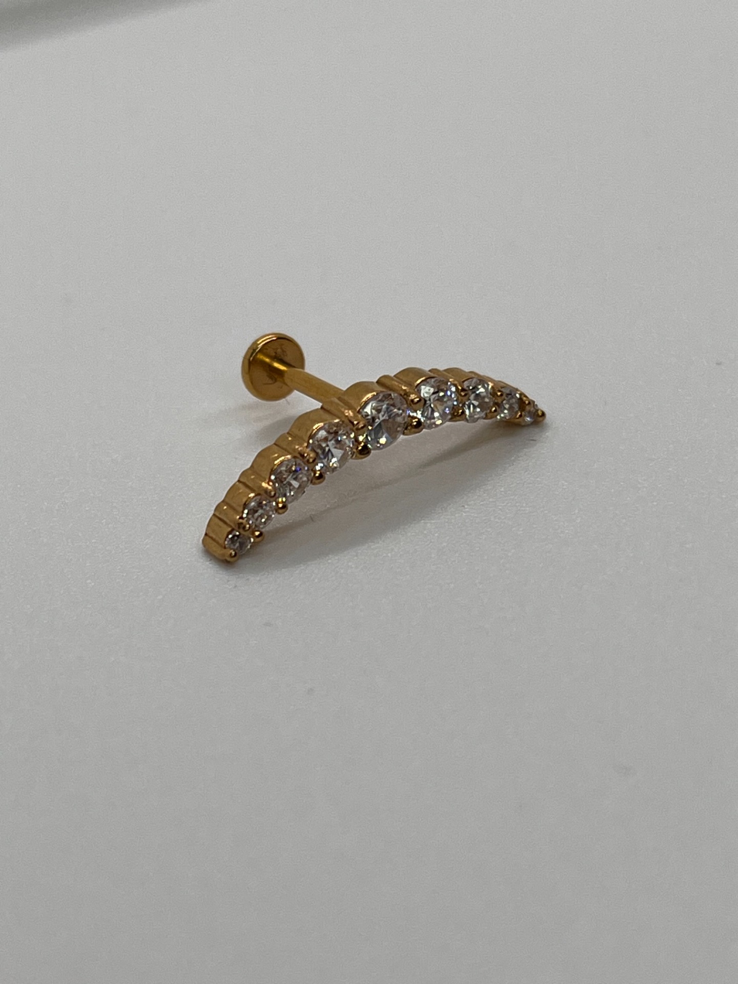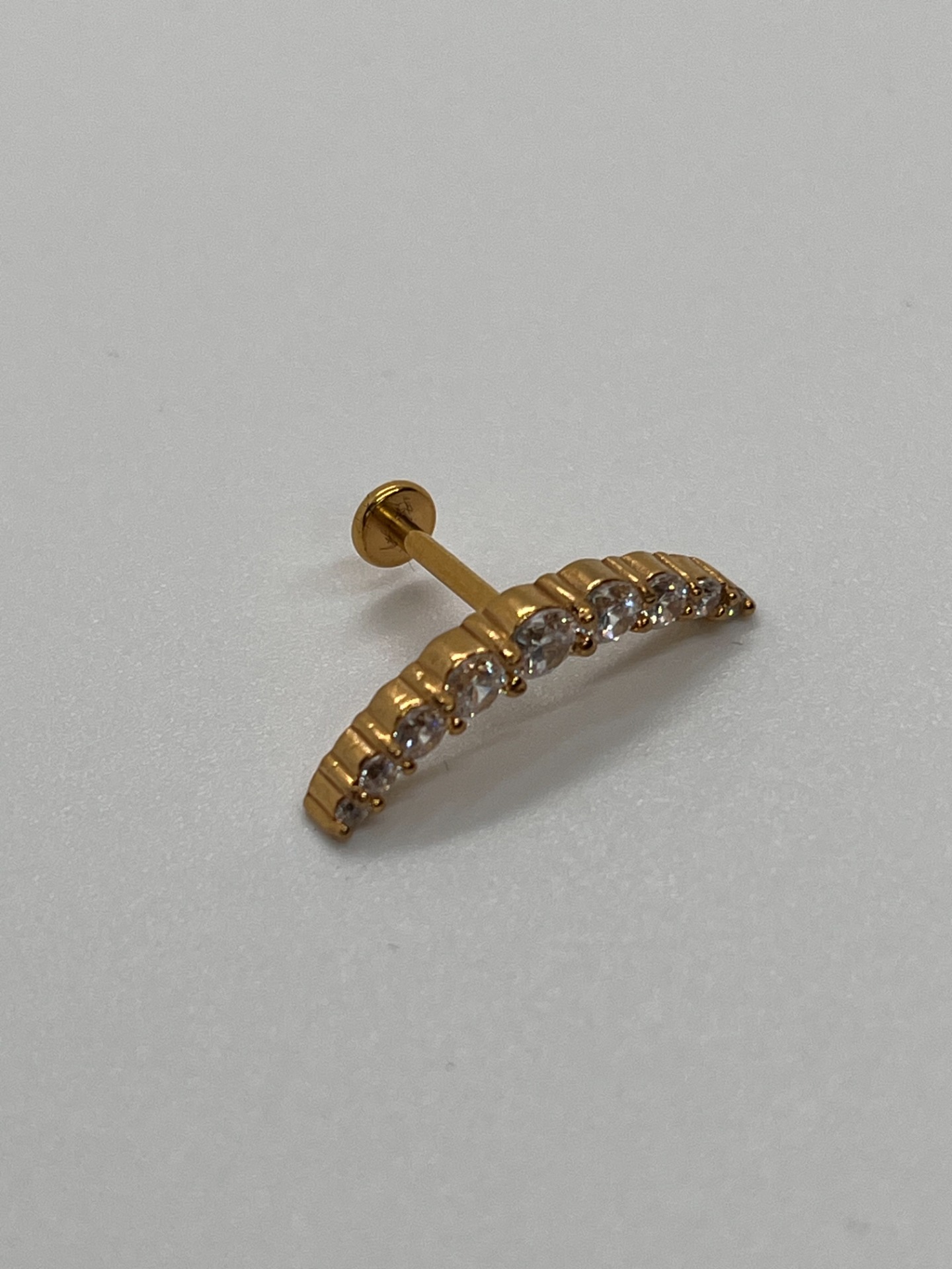 Výraznejší trblietavý oblúk (arc) z kamienkov, ktorý krásne doplní ušný "stack". Titánový push-in piercing v dĺžke 8 mm, dostupný v striebornom aj zlatom prevedení.