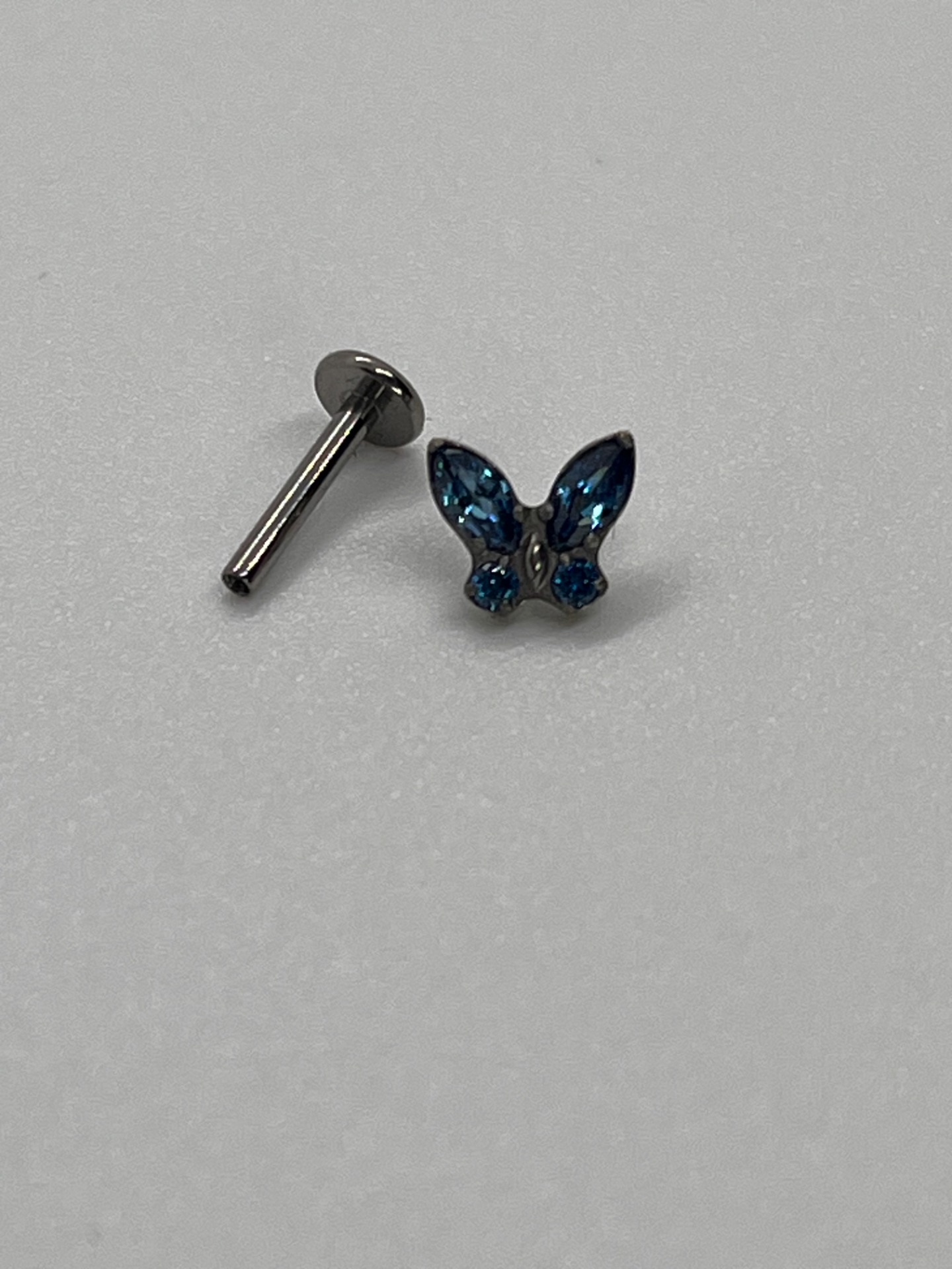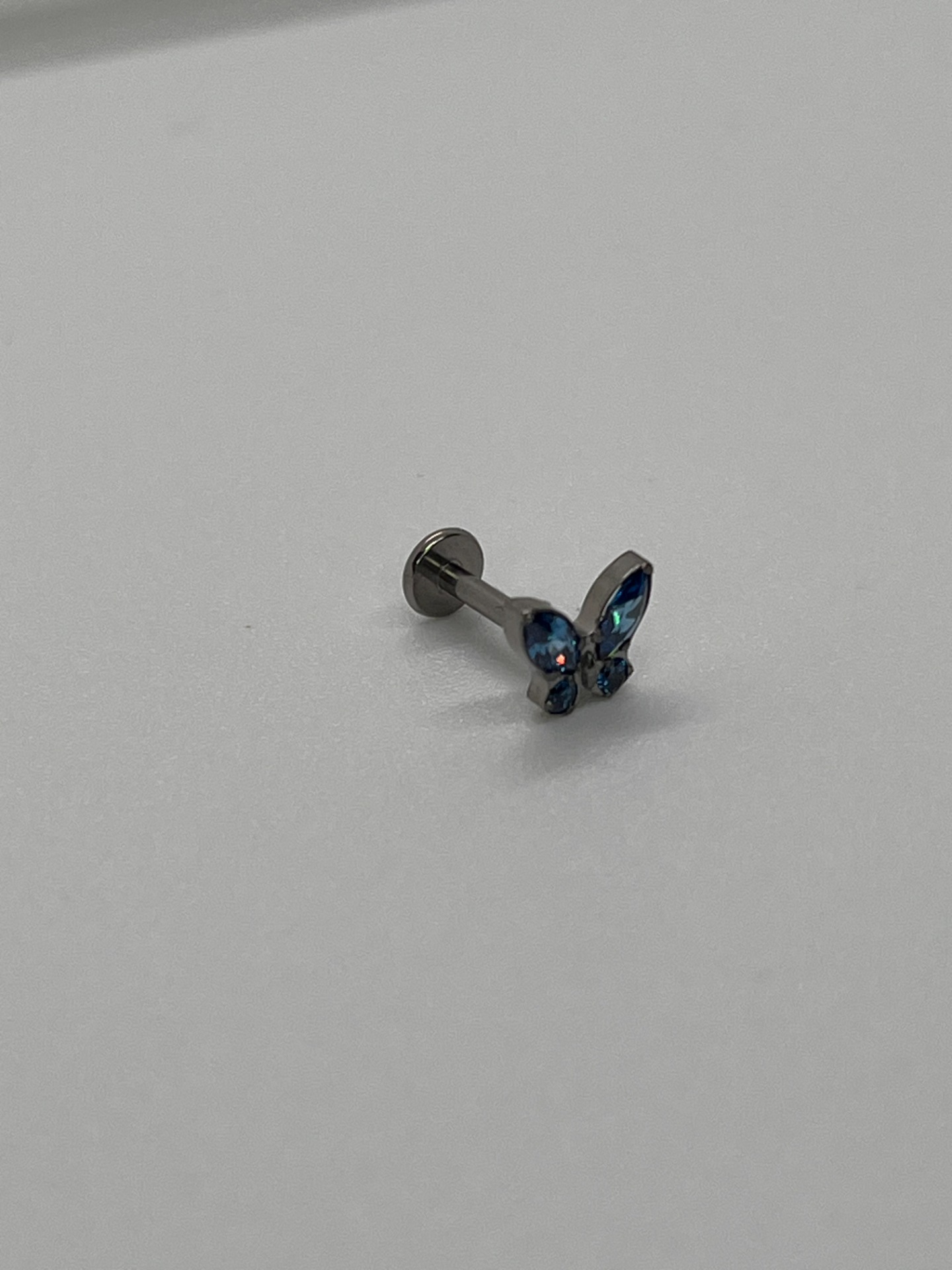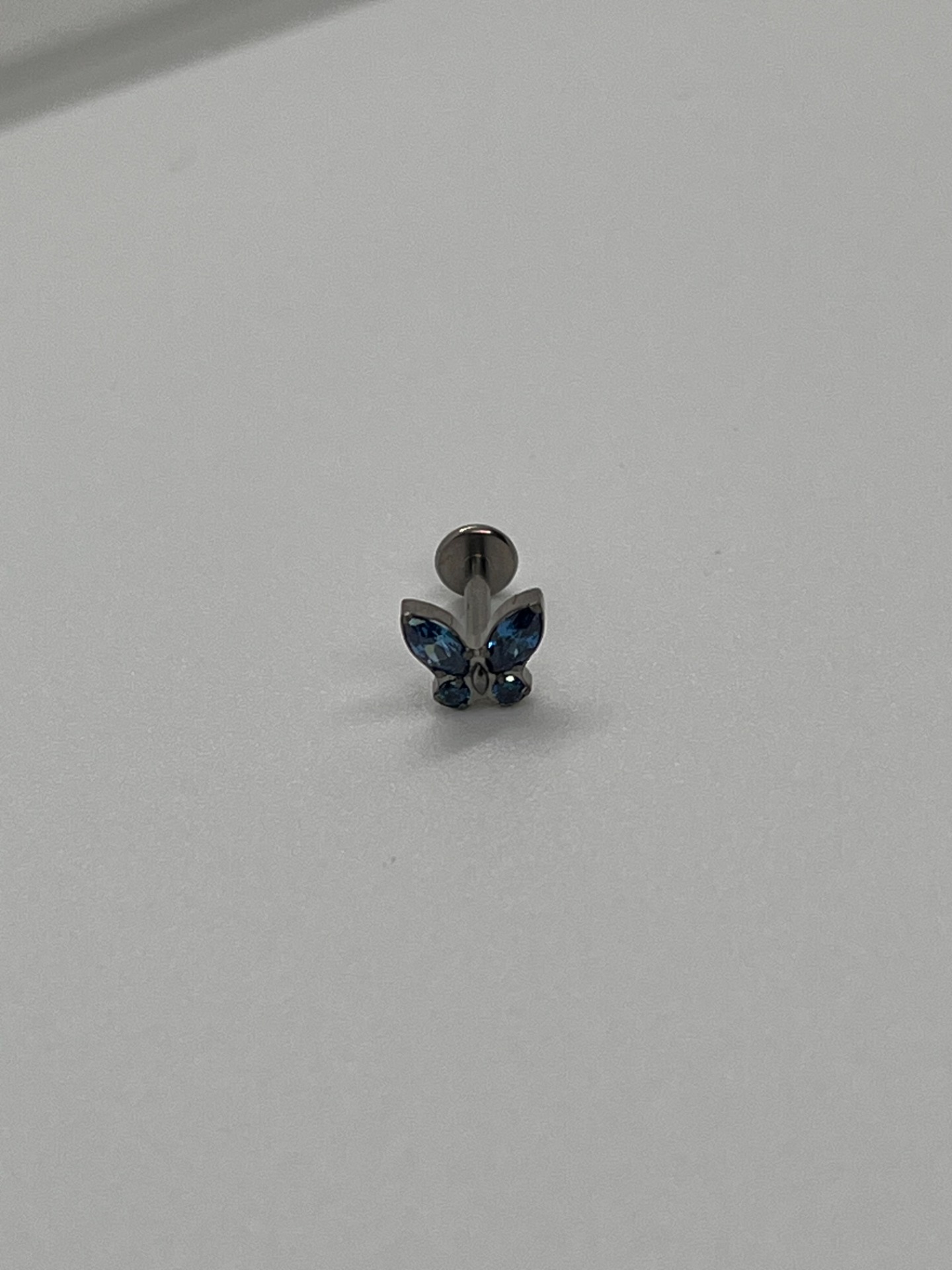 Jemný mini motýlik bez tykadiel s modrými kamienkami – decentný detail do ucha, ktorý sa krásne leskne. Titánový závitový piercing v dĺžke 8 mm v striebornom prevedení.