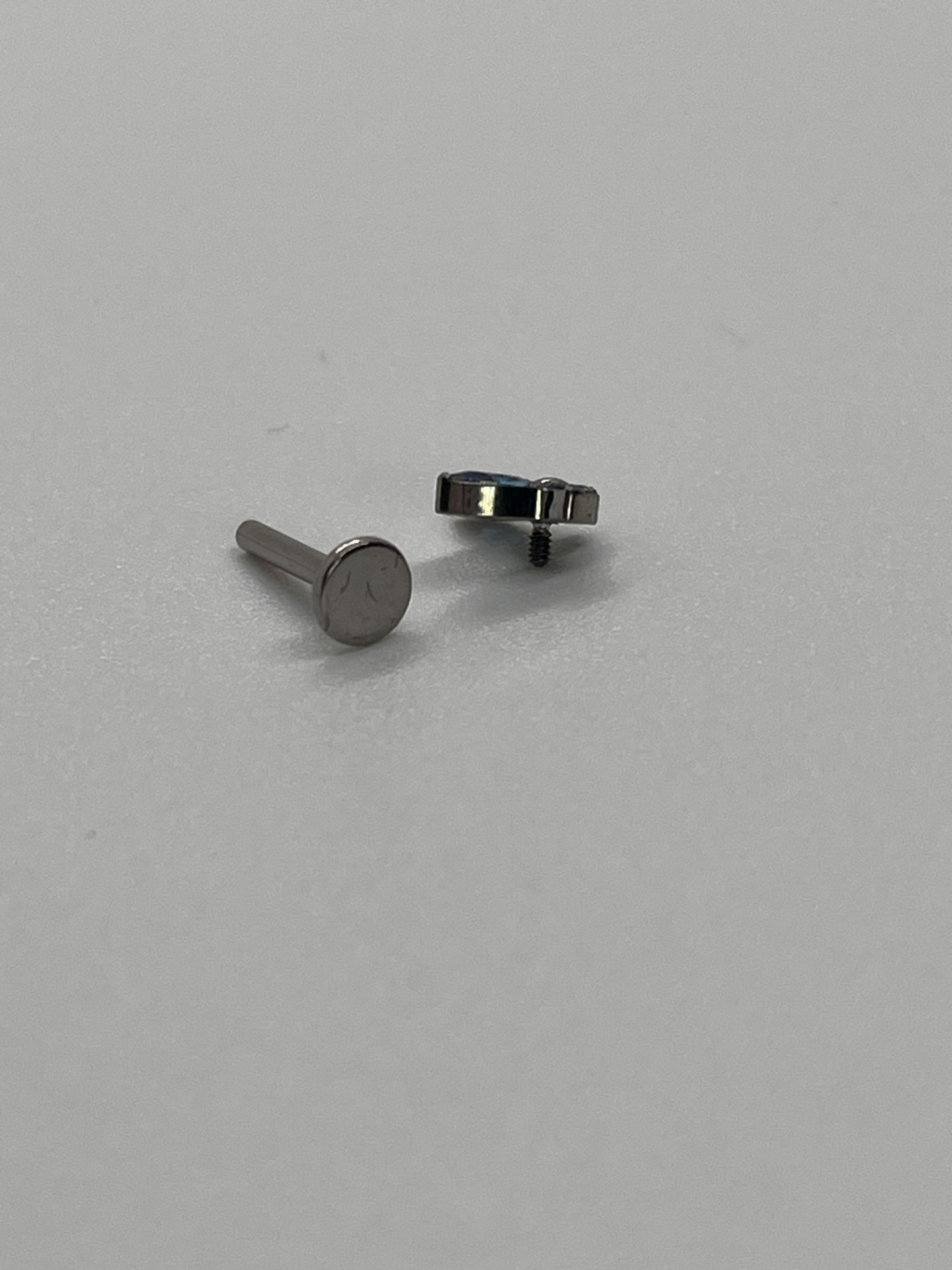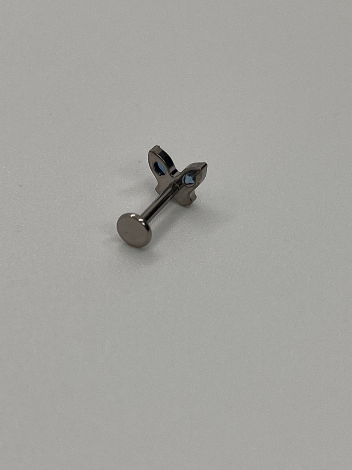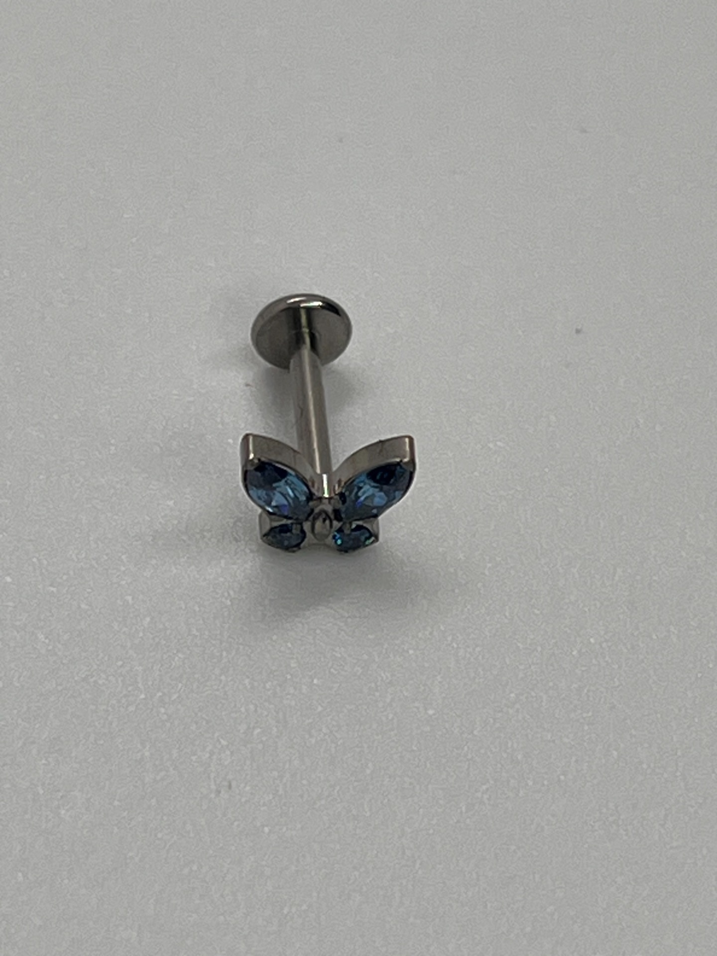 Jemný mini motýlik bez tykadiel s modrými kamienkami – decentný detail do ucha, ktorý sa krásne leskne. Titánový závitový piercing v dĺžke 8 mm v striebornom prevedení.