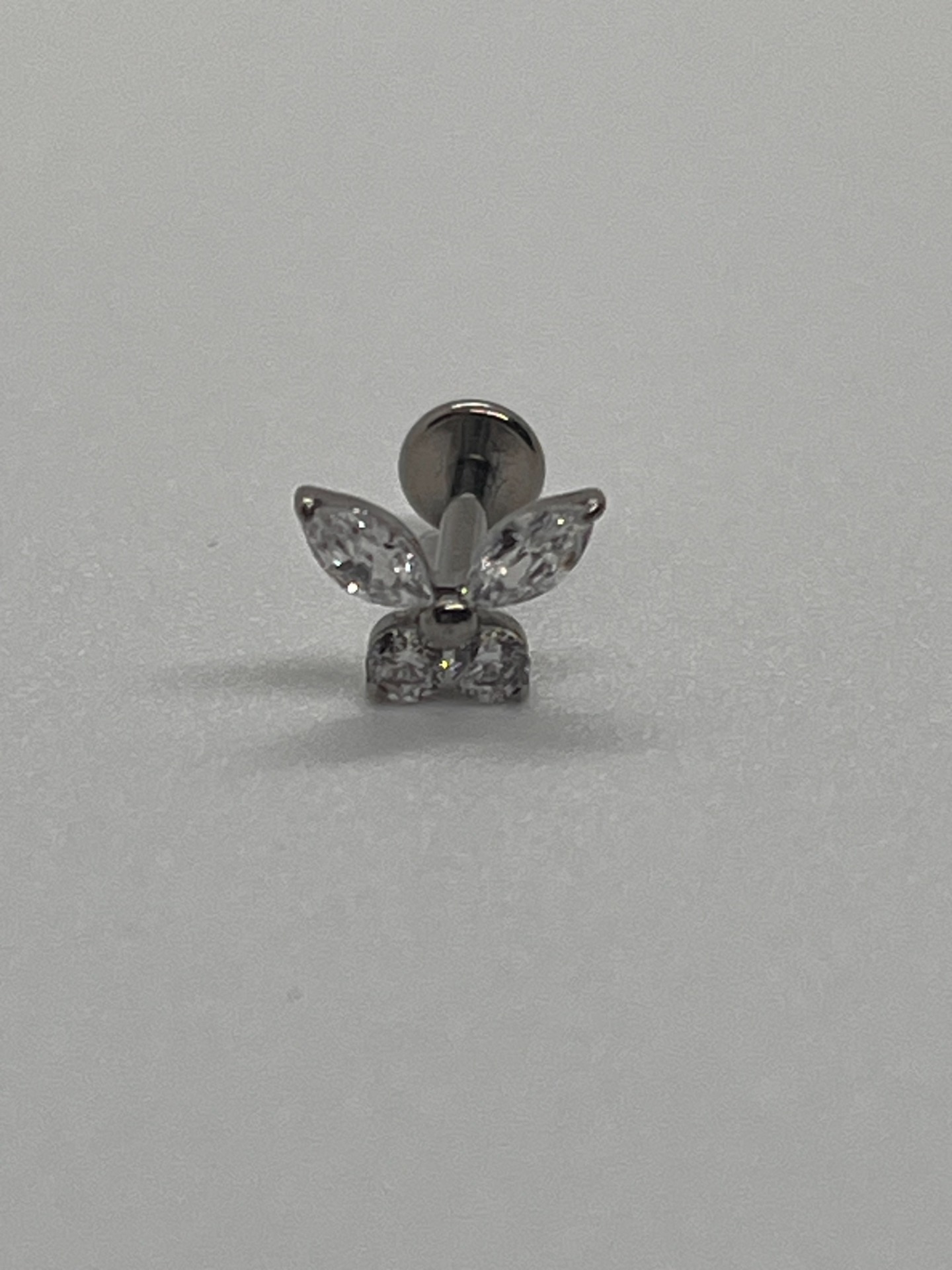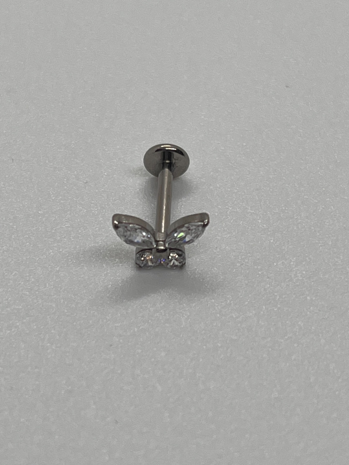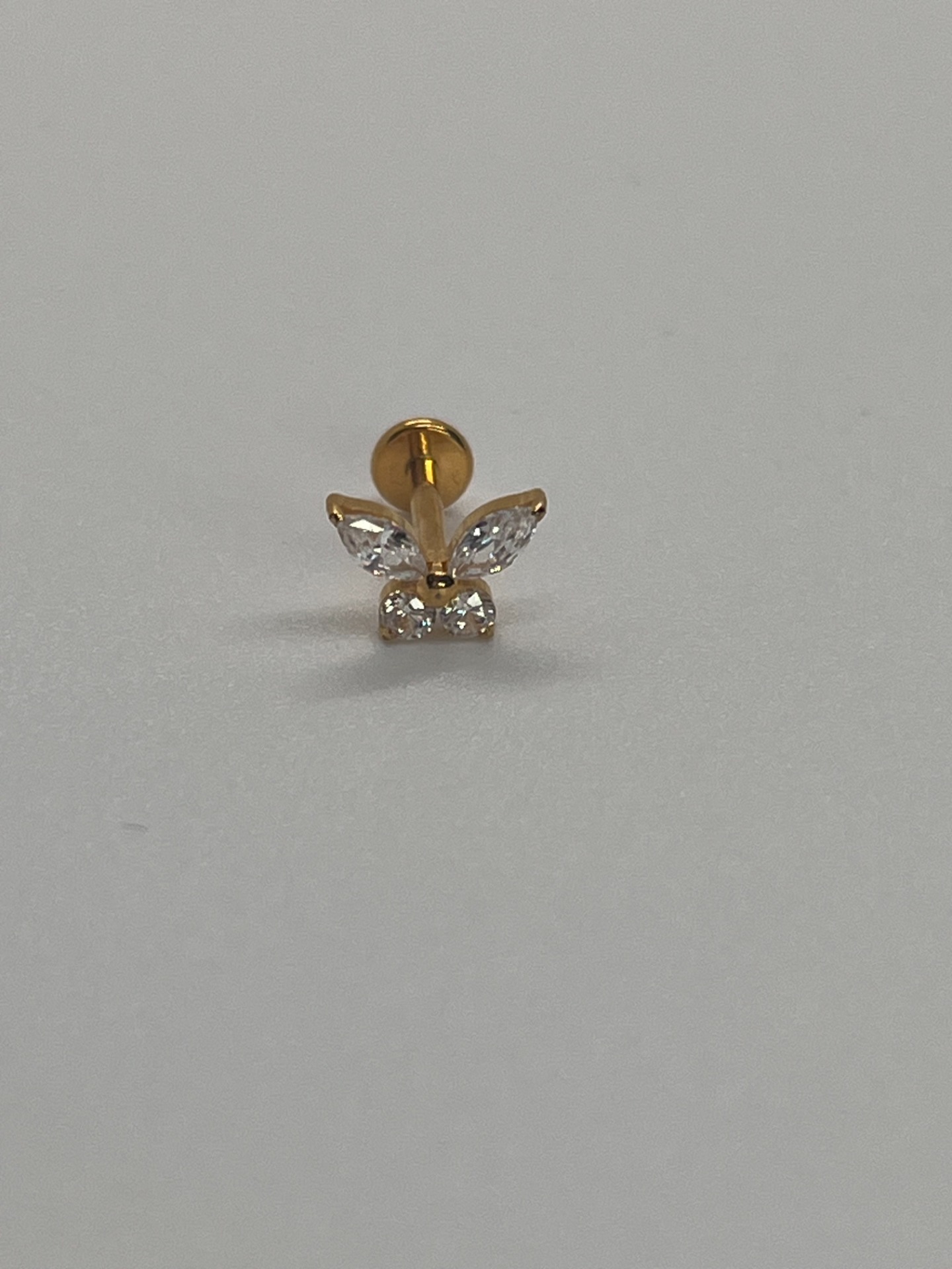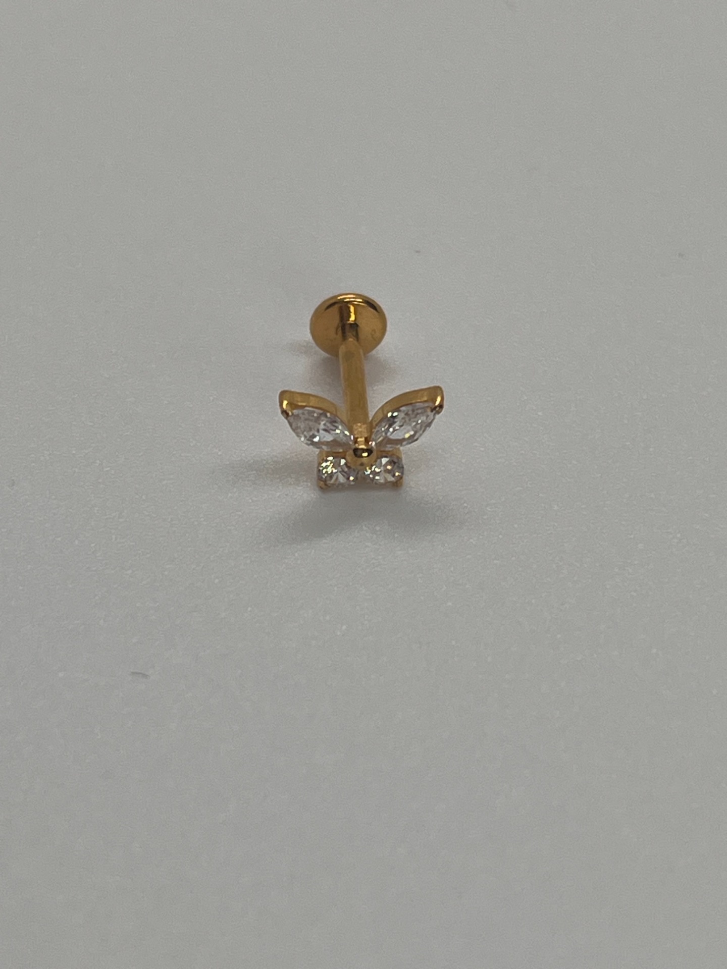 Elegantný závitový titanový piercing s motýľom osadeným trblietavými kamienkami. Dostupný v striebornom aj zlatom prevedení a v dĺžkach 6mm a 8mm