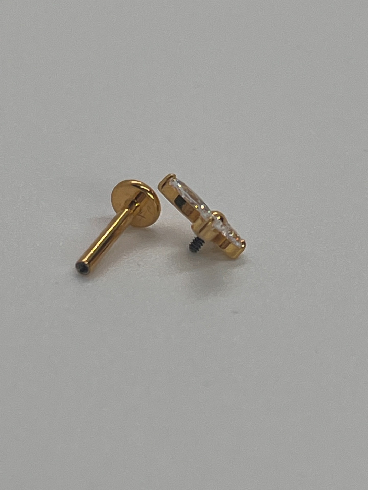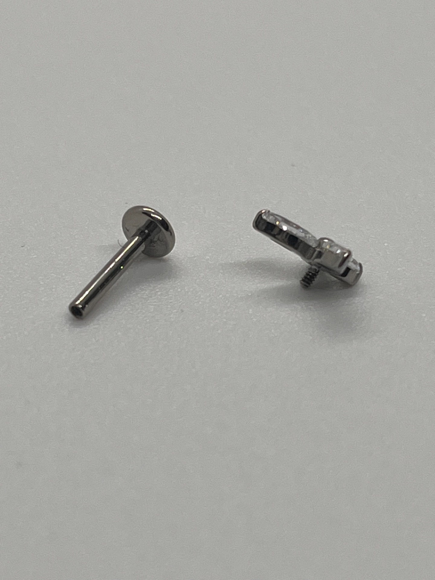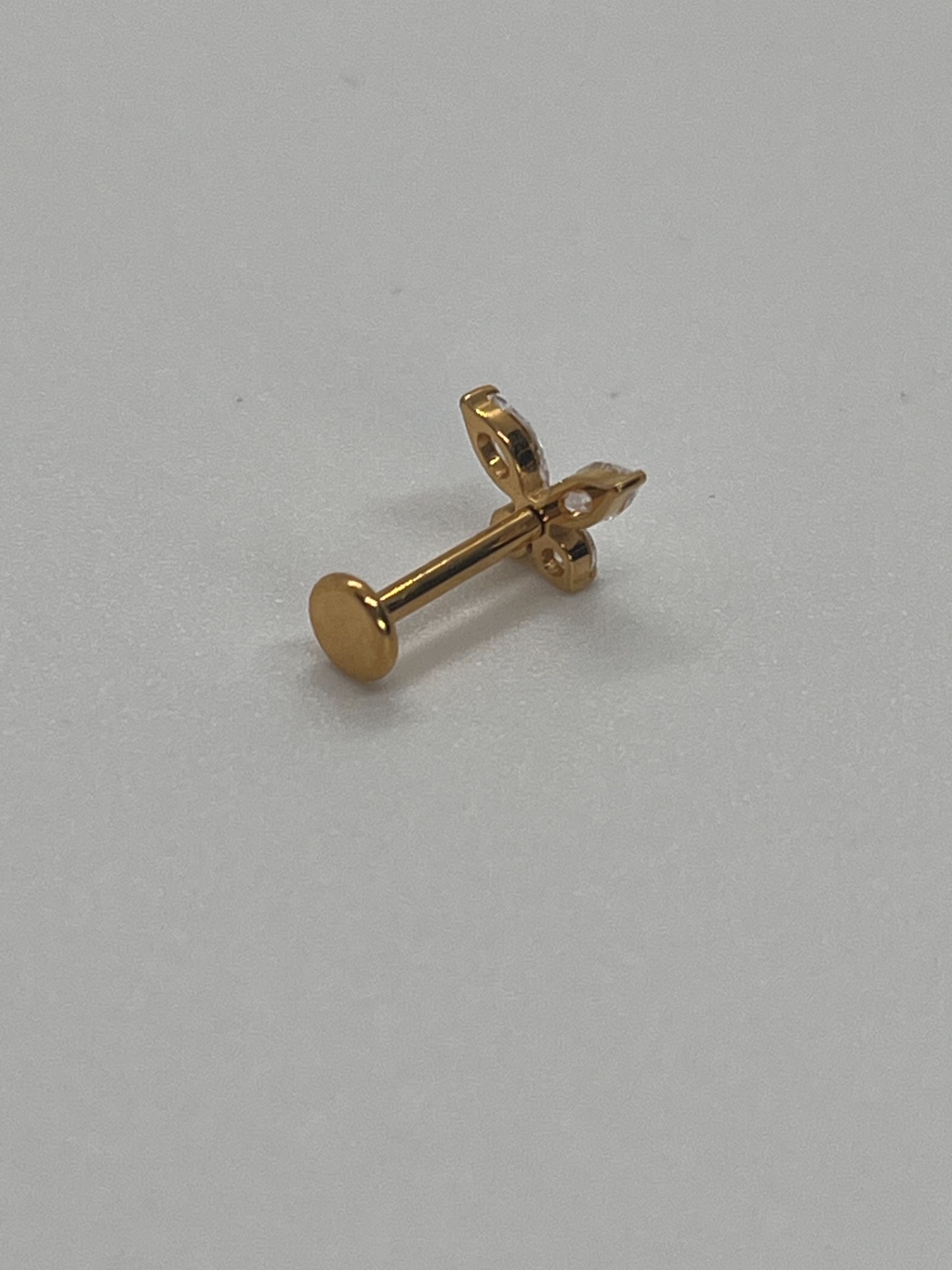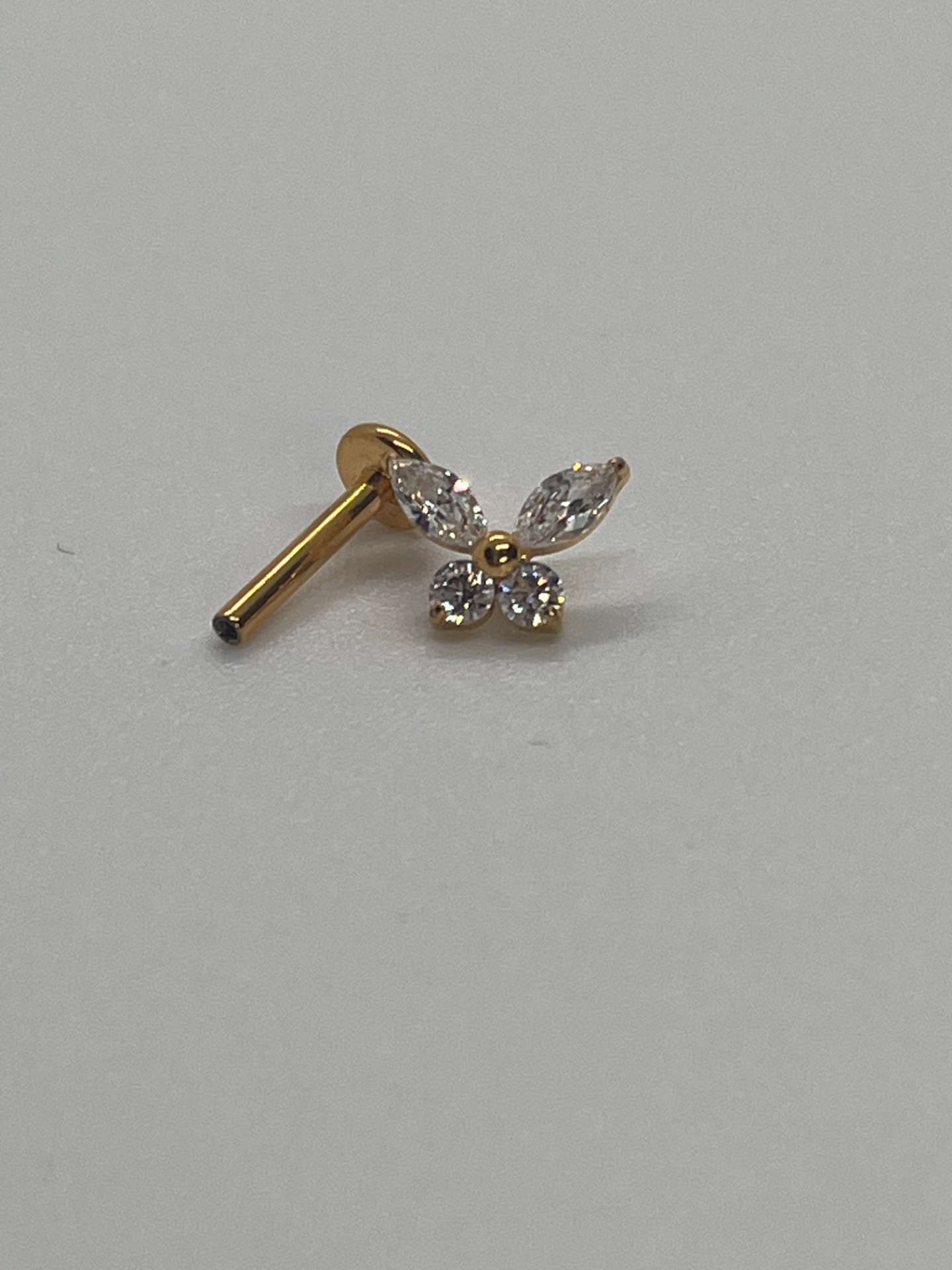 Elegantný závitový titanový piercing s motýľom osadeným trblietavými kamienkami. Dostupný v striebornom aj zlatom prevedení a v dĺžkach 6mm a 8mm