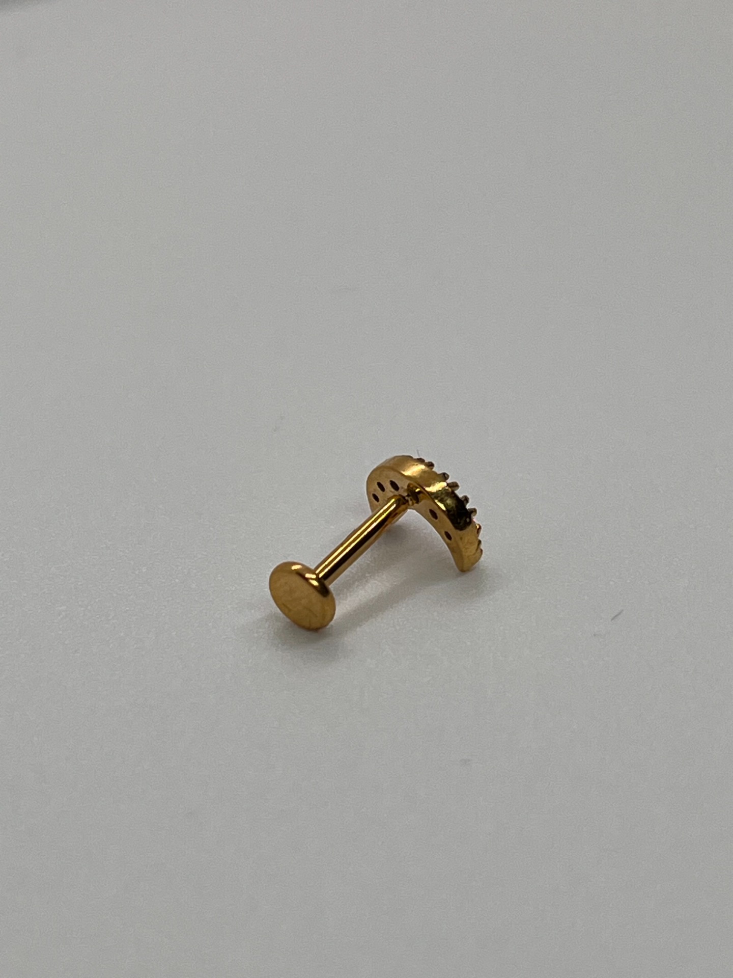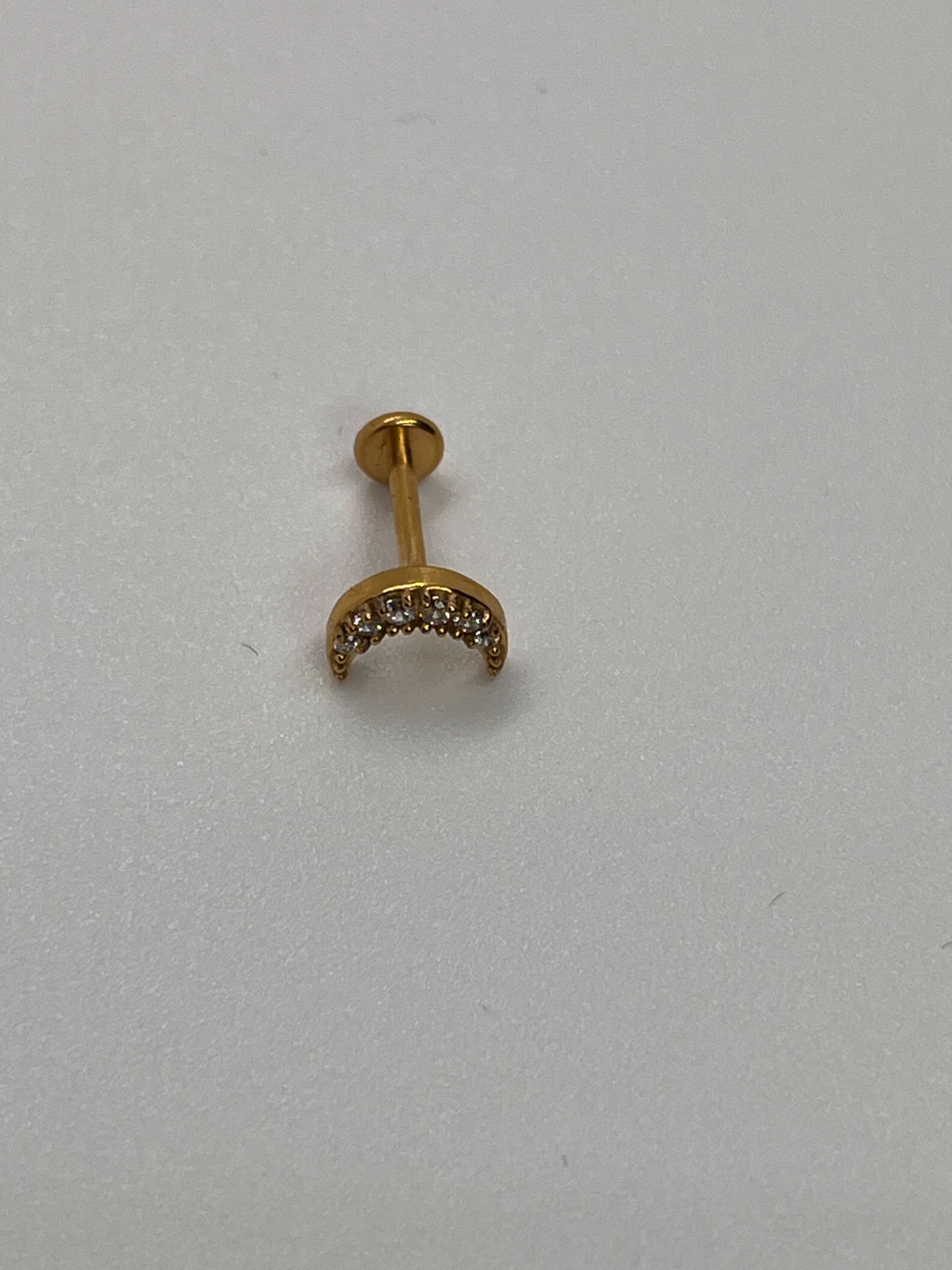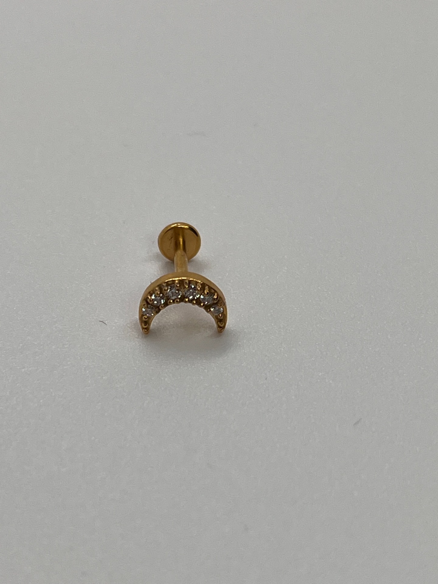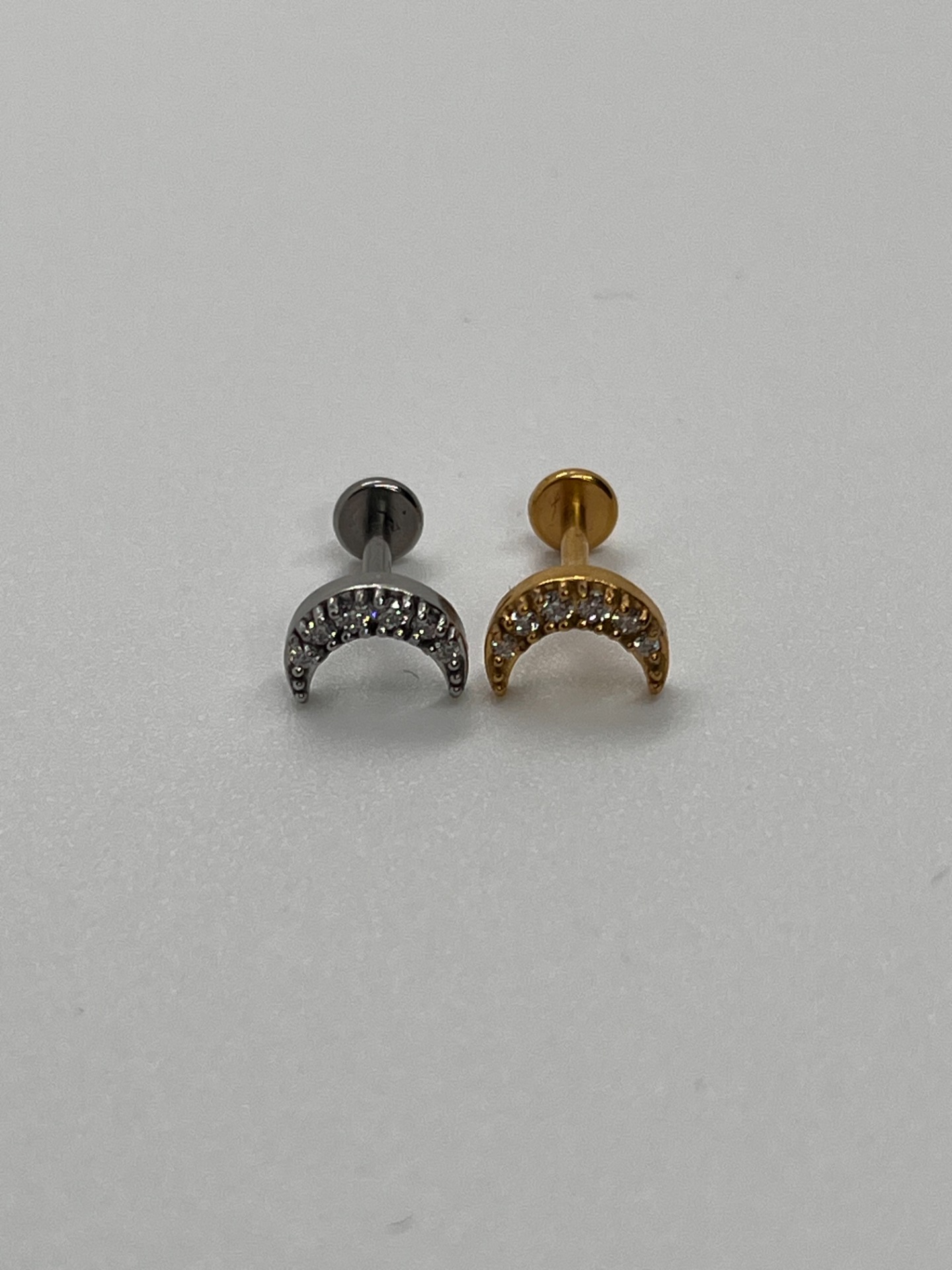 Elegantný polmesiac osadený trblietavými kamienkami pre jemný "moonlight" efekt. Titánový push-in piercing v dĺžke 8 mm, dostupný v striebornom aj zlatom prevedení.