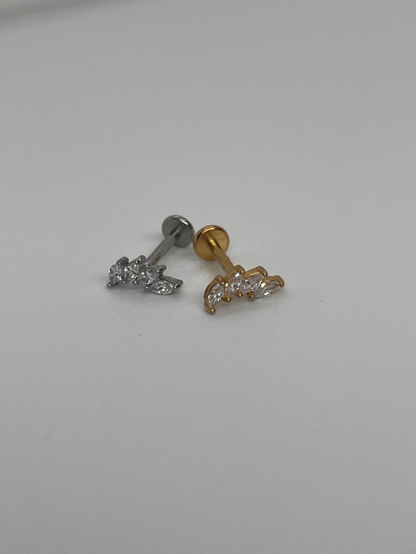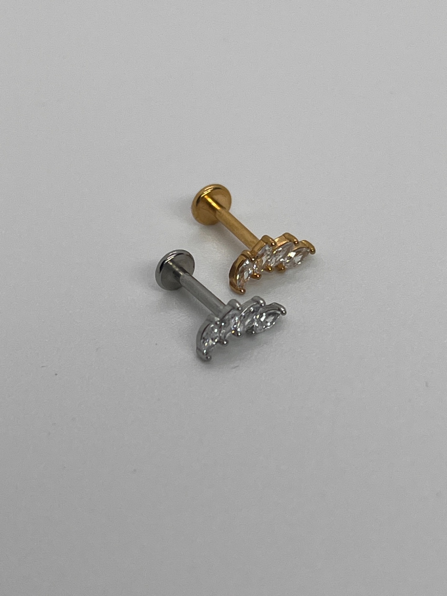 Elegantná tiara (korunka) z podlhovastých kamienkov, ktorá pôsobí jemne, ale luxusne. Titánový push-in (threadless) piercing v dĺžke 8 mm, dostupný v striebornom aj zlatom prevedení.