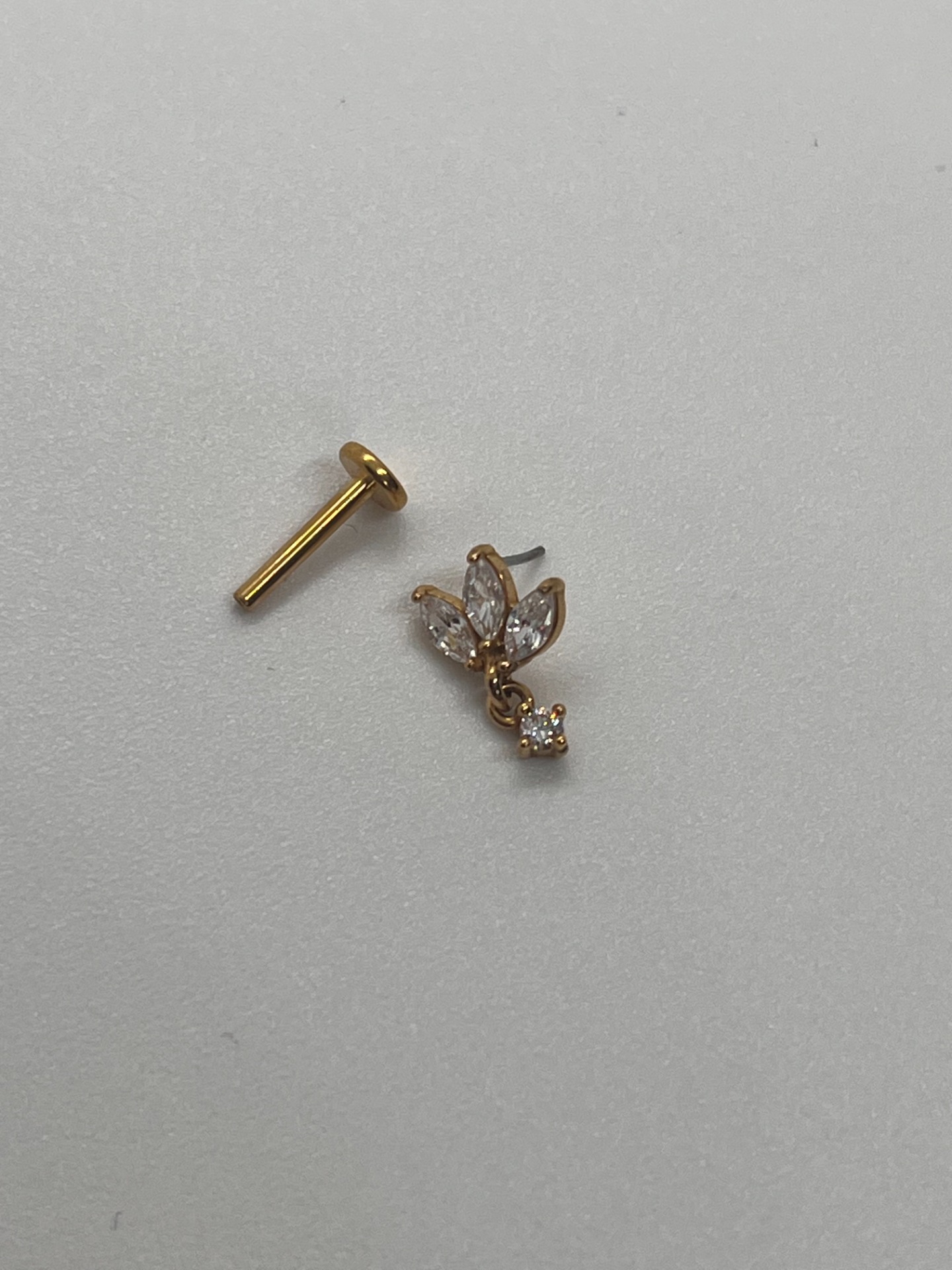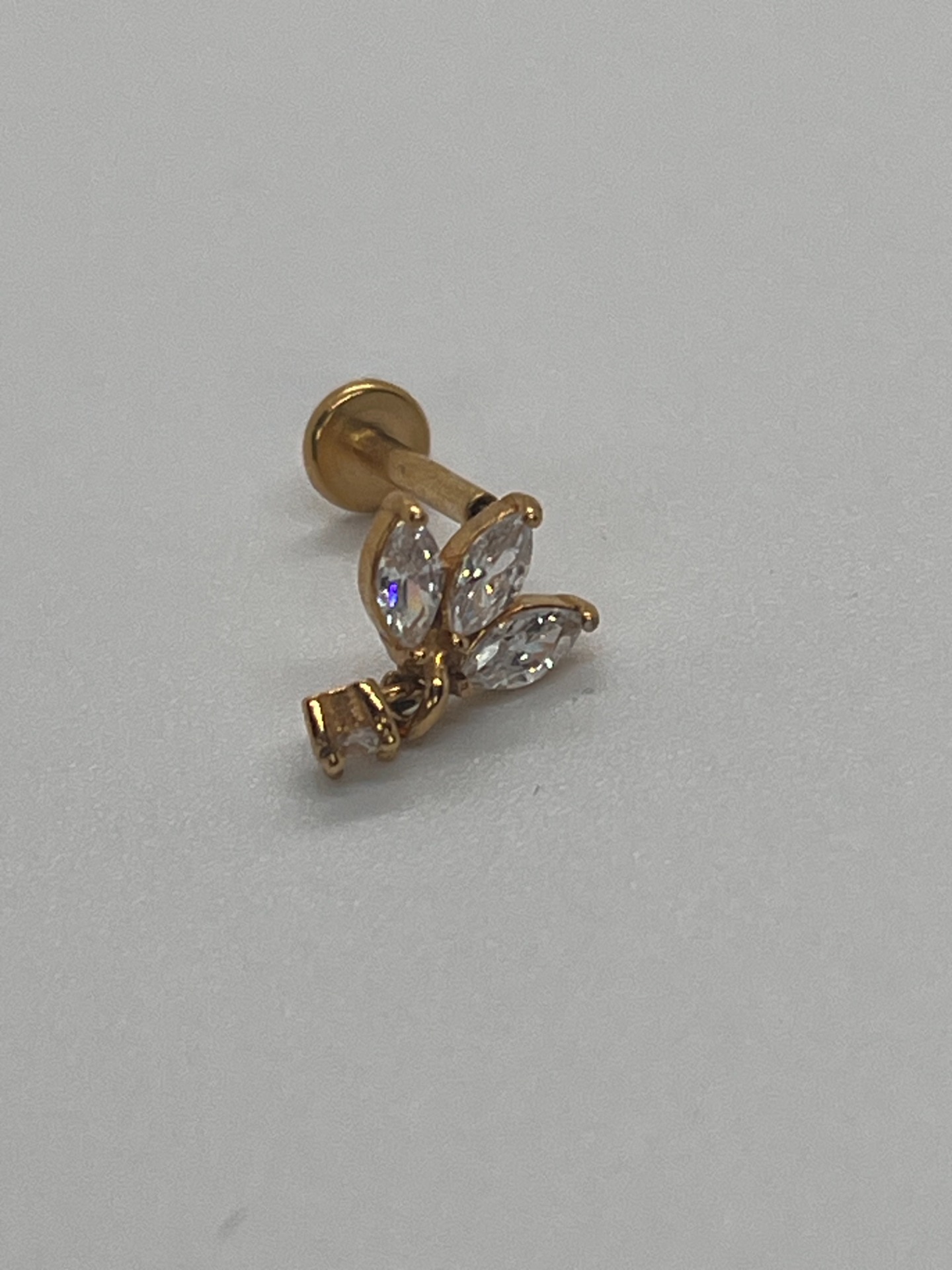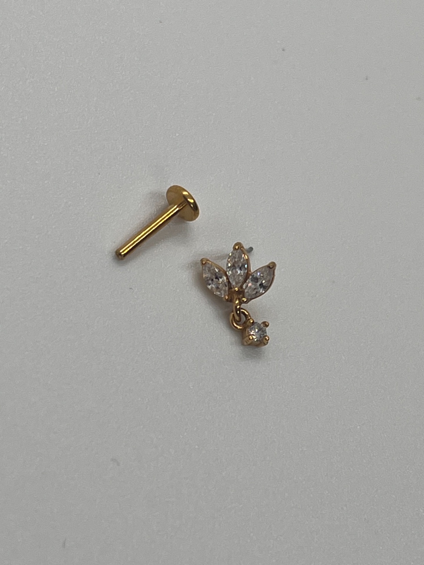 Romantický tulipánik z trblietavých kamienkov doplnený o mini visiacu kvapku. Titanový push-in piercing v dĺžke 8mm (strieborný/zlatý)