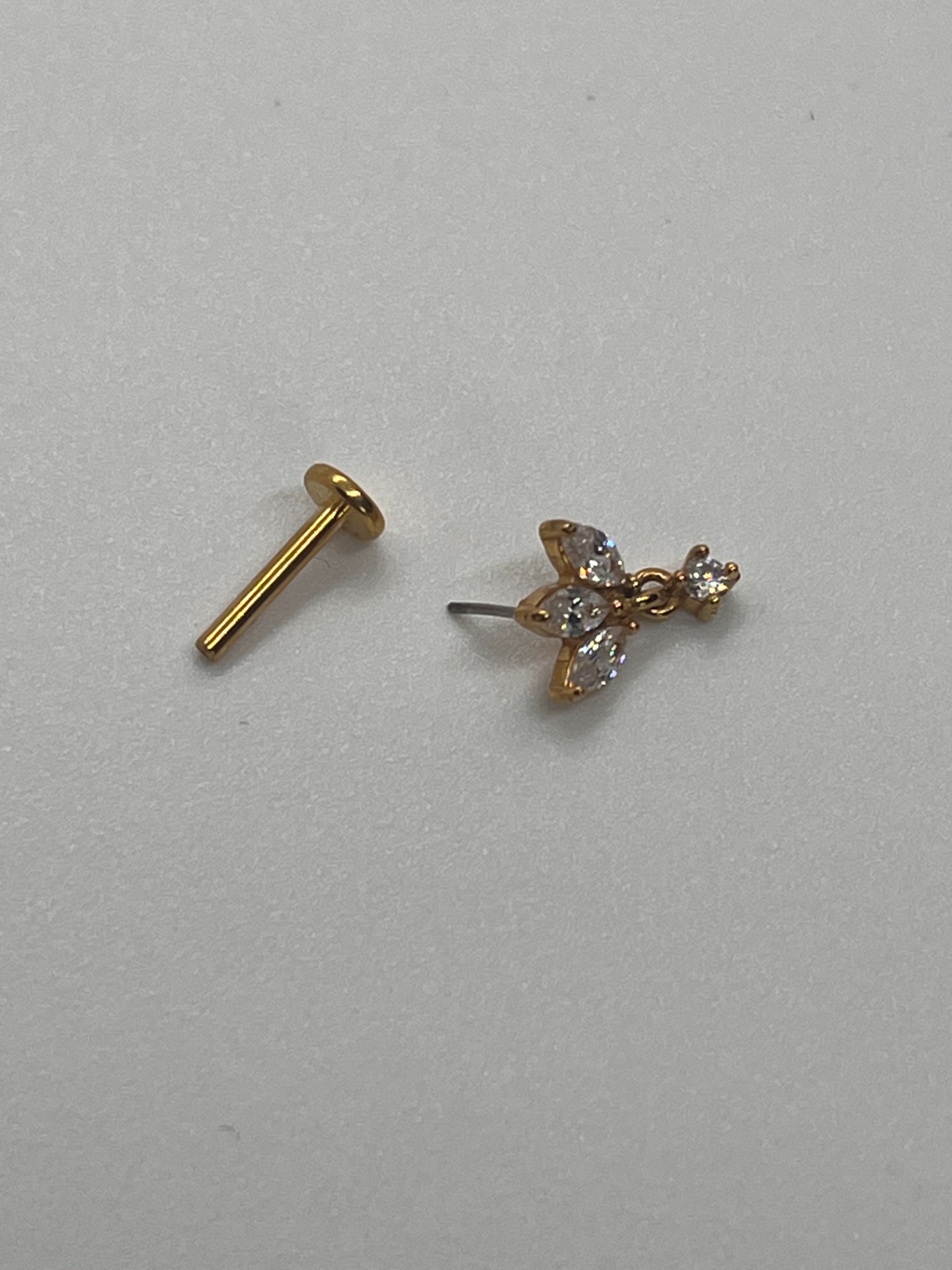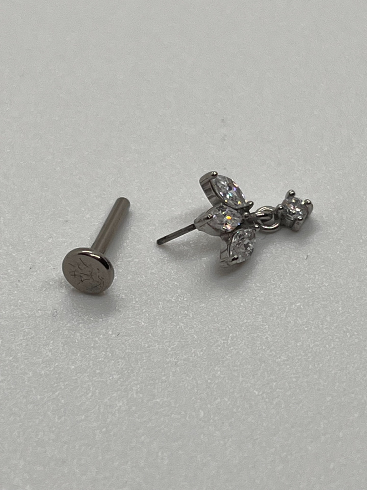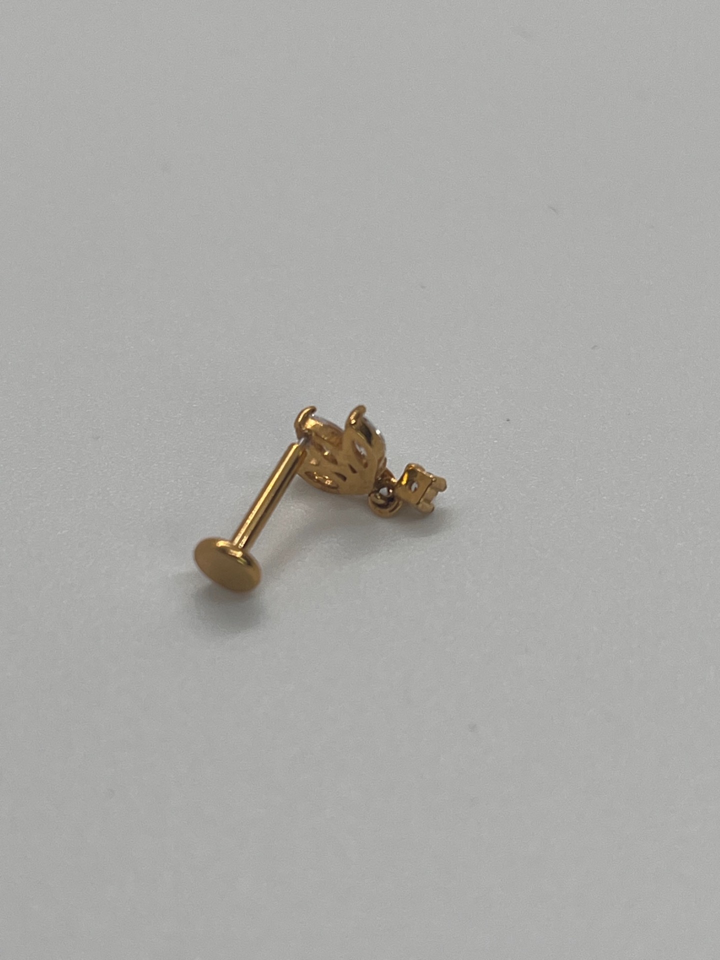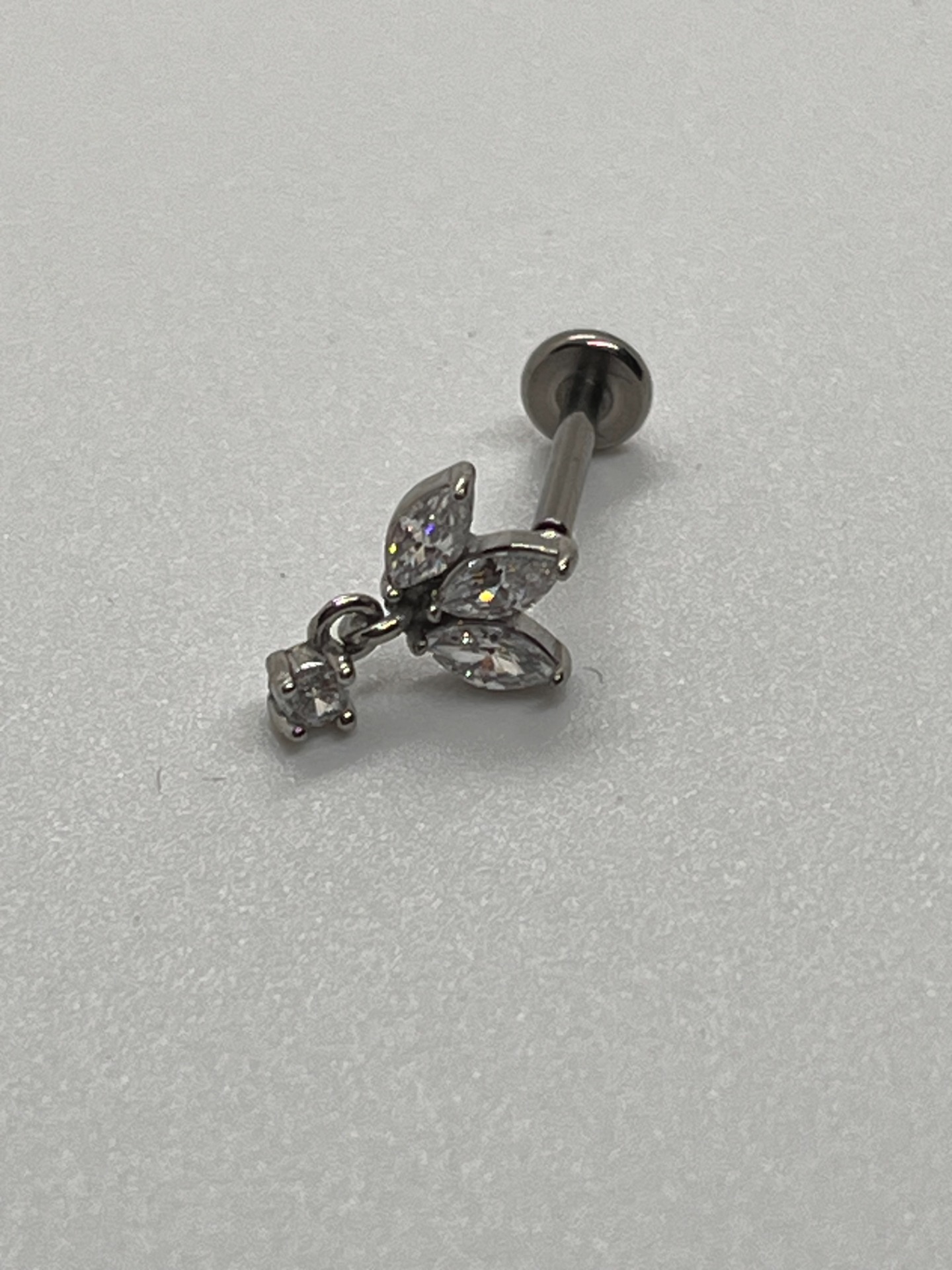 Romantický tulipánik z trblietavých kamienkov doplnený o mini visiacu kvapku. Titanový push-in piercing v dĺžke 8mm (strieborný/zlatý)